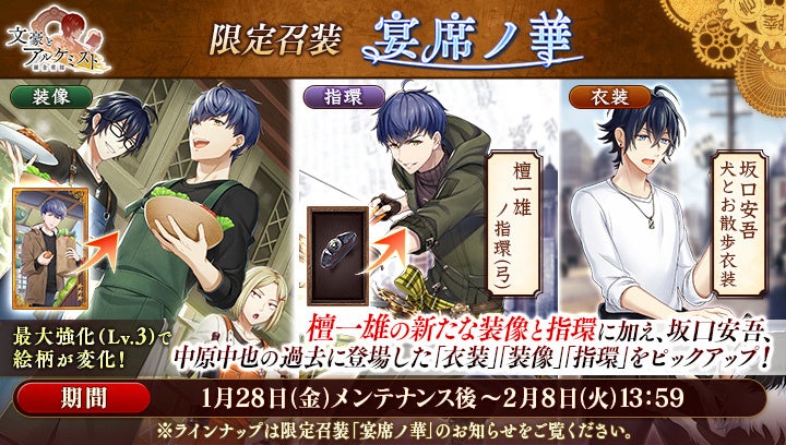 文豪の「衣装」や、会派に装備する事で能力を強化できる「装像」などが入手できるコンテンツ「召装」に、限定召装「宴席ノ華」が期間限定で登場します。この召装では新しく追加された檀一雄の装像と指環が一定の確率で入手可能な他、過去に登場した坂口安吾、中原中也の衣装、装像、指環などを入手できます。