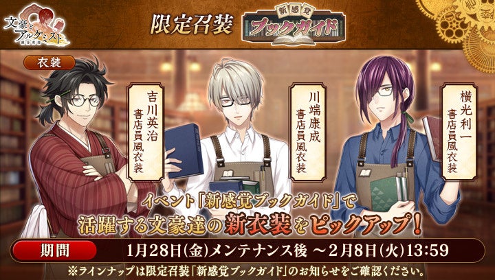 さらに、イベントと同時に開催される限定召装「新感覚ブックガイド」にて新規追加された「川端康成」「横光利一」「吉川英治」の〈書店員風衣装〉を編成すると、得点の獲得率がそれぞれ30%上昇します。