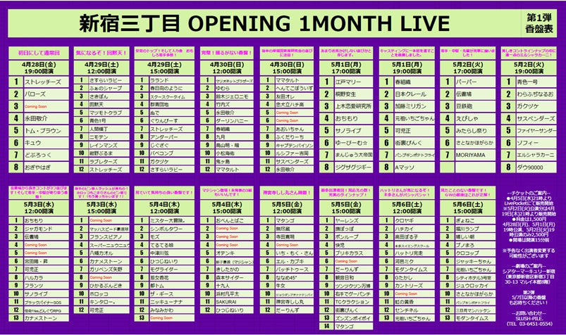 4月28日(金)のグランドオープン初日からの1カ月間は「新宿三丁目 OPENING 1MONTH LIVE」と題して、お笑いライブの開催が決定しています。