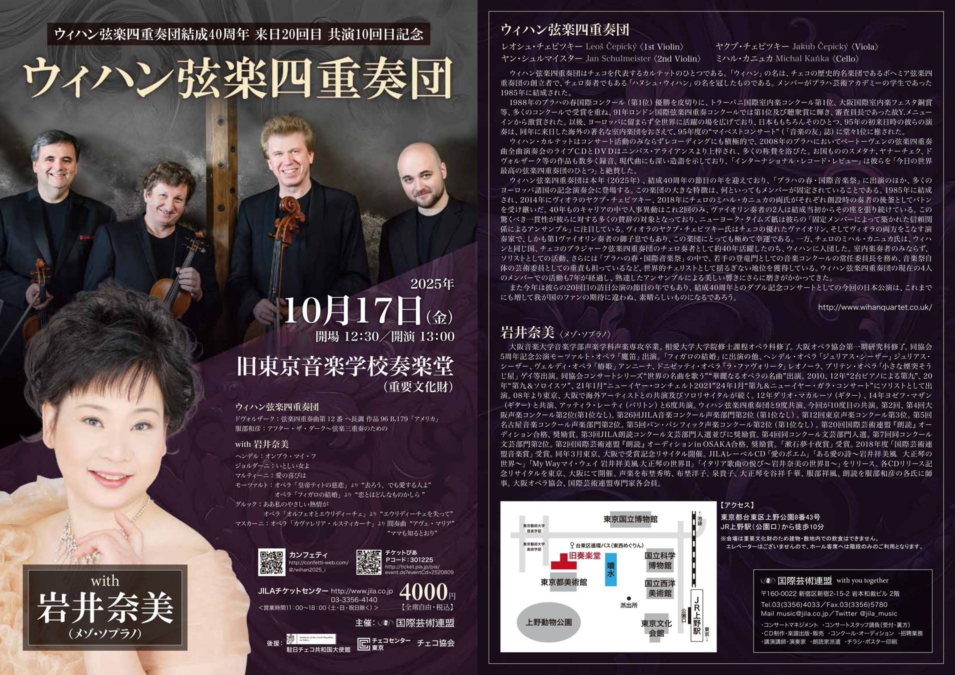 本年(2025年)、結成40周年の節目の年を迎えており、「プラハの春・国際音楽祭」に出演のほか、多くのヨーロッパ諸国の記念演奏会に登場する。この楽団の大きな特徴は、何といってもメンバーが固定されていることである。1985年に結成され、2014年にヴィオラのヤクブ・チェピツキー、2018年にチェロのミハル・カニュカの両氏がそれぞれ創設時の奏者の後釜としてバトンを受け継いだ。40年ものキャリアの中で人事異動はこれ2回のみ、ヴァイオリン奏者の2人は結成当初からその座を張り続けている。この驚くべき一貫性が彼らに対する多くの賛辞の対象となっており、ニューヨーク・タイムズ紙は彼らの「固定メンバーによって築かれた信頼関係によるアンサンブル」に注目している。ヴィオラのヤクブ・チェピツキー氏はチェコの優れたヴァイオリン、そしてヴィオラの両方をこなす演奏家で、しかも第1ヴァイオリン奏者の御子息でもあり、この楽団にとっても極めて幸運である。一方、チェロのミハル・カニュカ氏は、ウィハンと同じ国、チェコのプラジャーク弦楽四重奏団のチェロ奏者として約40年活躍したのち、ウィハンに入団した。室内楽奏者のみならず、ソリストとしての活動、さらには「プラハの春・国際音楽祭」の中で、若手の登竜門としての音楽コンクールの常任委員長を務め、音楽祭自体の芸術委員としての重責を担っているなど、世界的チェリストとして揺るぎない地位を獲得している。