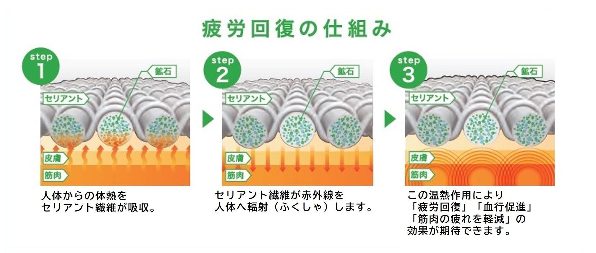 「トップバリュ セレクト セリアント」は、アメリカのホロジェニックス(HOLOGENIX)社が開発した、数種類の微細な鉱石を練りこんだ特殊な素材「CELLIANTⓇ」※4)(セリアント)を日本で初めて使用しており、国内プライベートブランドとして初めて、一般医療機器として届出された疲労回復ウェアです。着用することで、以下の効果が期待できます。※3)(洗濯後も同様の効果が期待できます。)