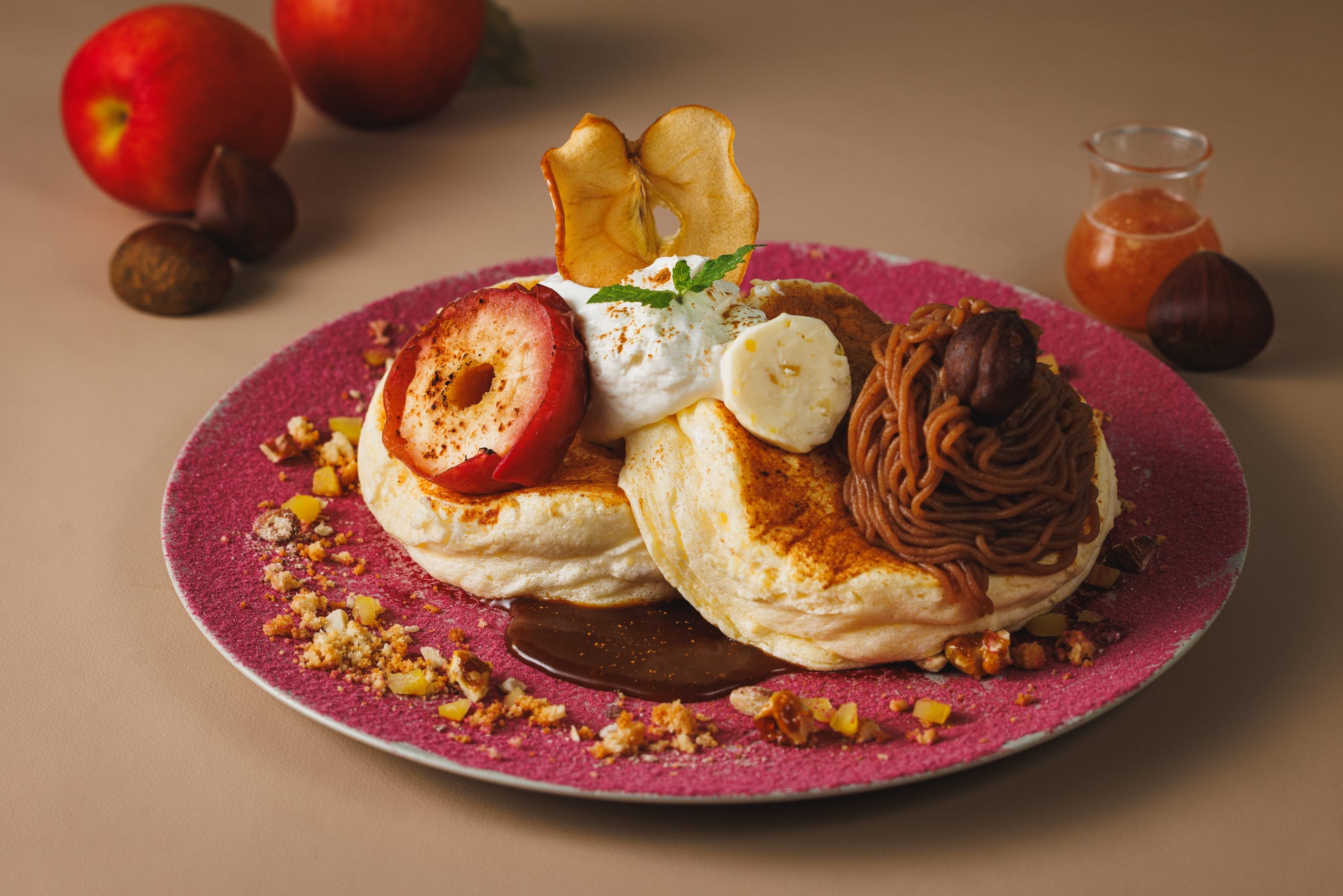 秋の代表「モンブランパンケーキ」と旬のフルーツ『りんご』を掛け合わせた新しい一皿。