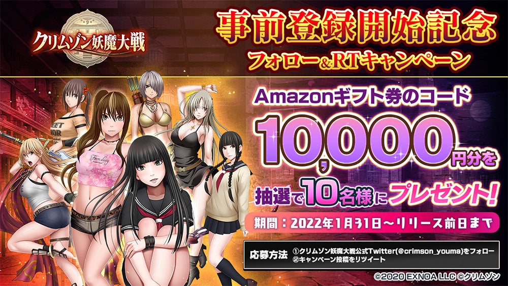 『クリムゾン妖魔大戦』の事前登録開始を記念して、Amazonギフト券コードが抽選であたるリツイートキャンペーンを開催します。公式Twitter(https://twitter.com/crimson_youma)から投稿される指定ツイートをRTして抽選に参加しましょう!