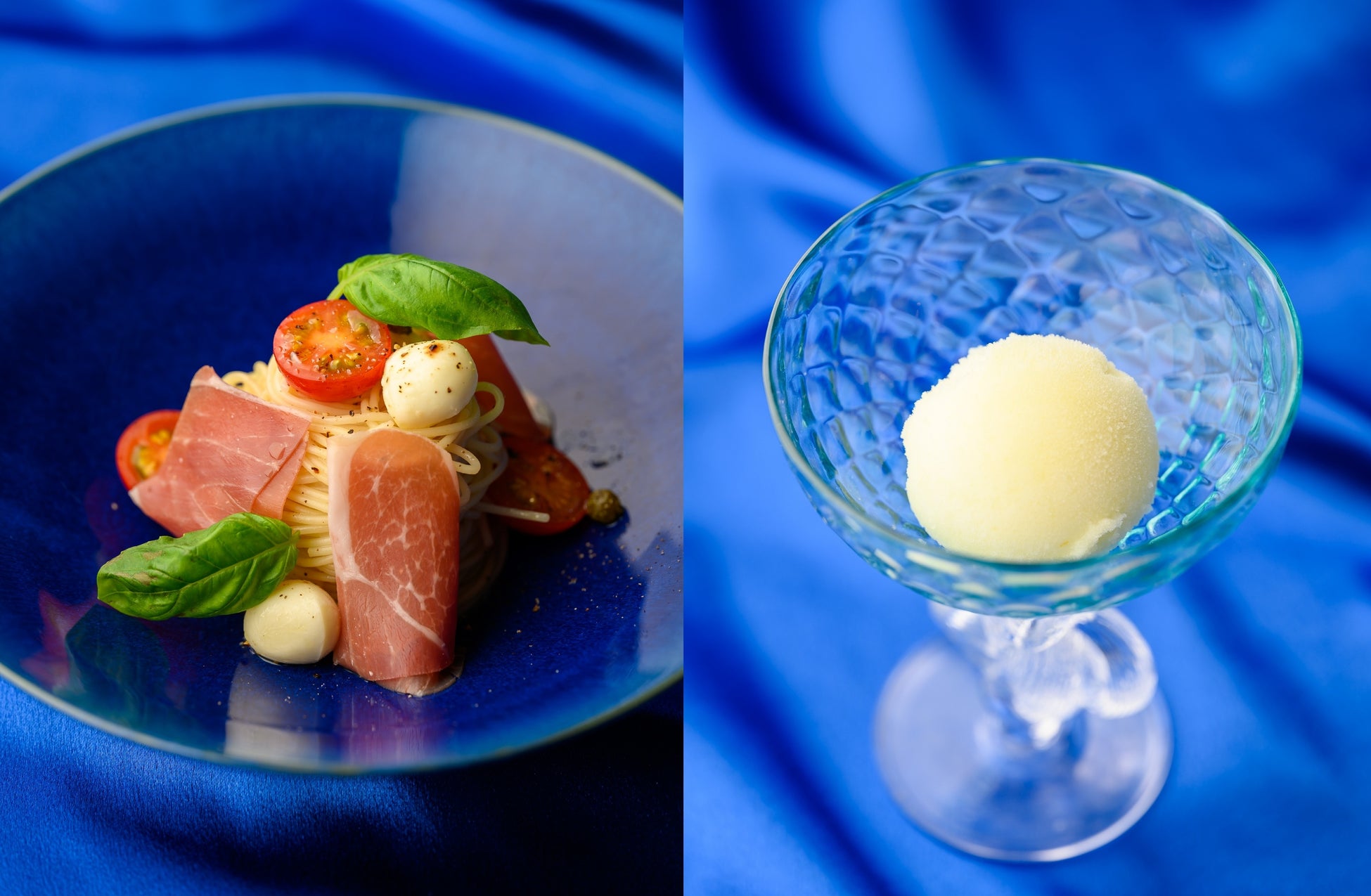 外付けプレートはお口直しにぴったりな生ハムとシャインマスカットを添えたカッペリーニと、富山県の人気フランス菓子専門店「Monsieur J (ムッシュー・ジー)」のタヒチ産バニラを用いた新作アイスクリームをお楽しみいただけます。希少価値の高い高品質なタヒチ産バニラは、その最大の魅力である独特で豊かな香りと風味が、フルーティーで爽やかな香りのシャインマスカットと調和し、リッチな味わいを生み出します。