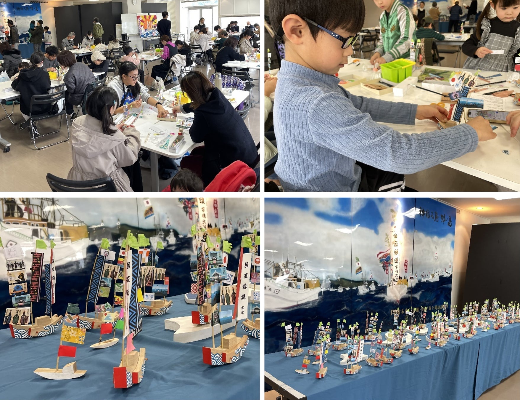 今回のワークショップでは、アニメのデザインもあしらったみあれ祭の船作りを楽しんだ後、大海原を再現したステージに完成した船を展示して、みあれ祭を再現、体感した。