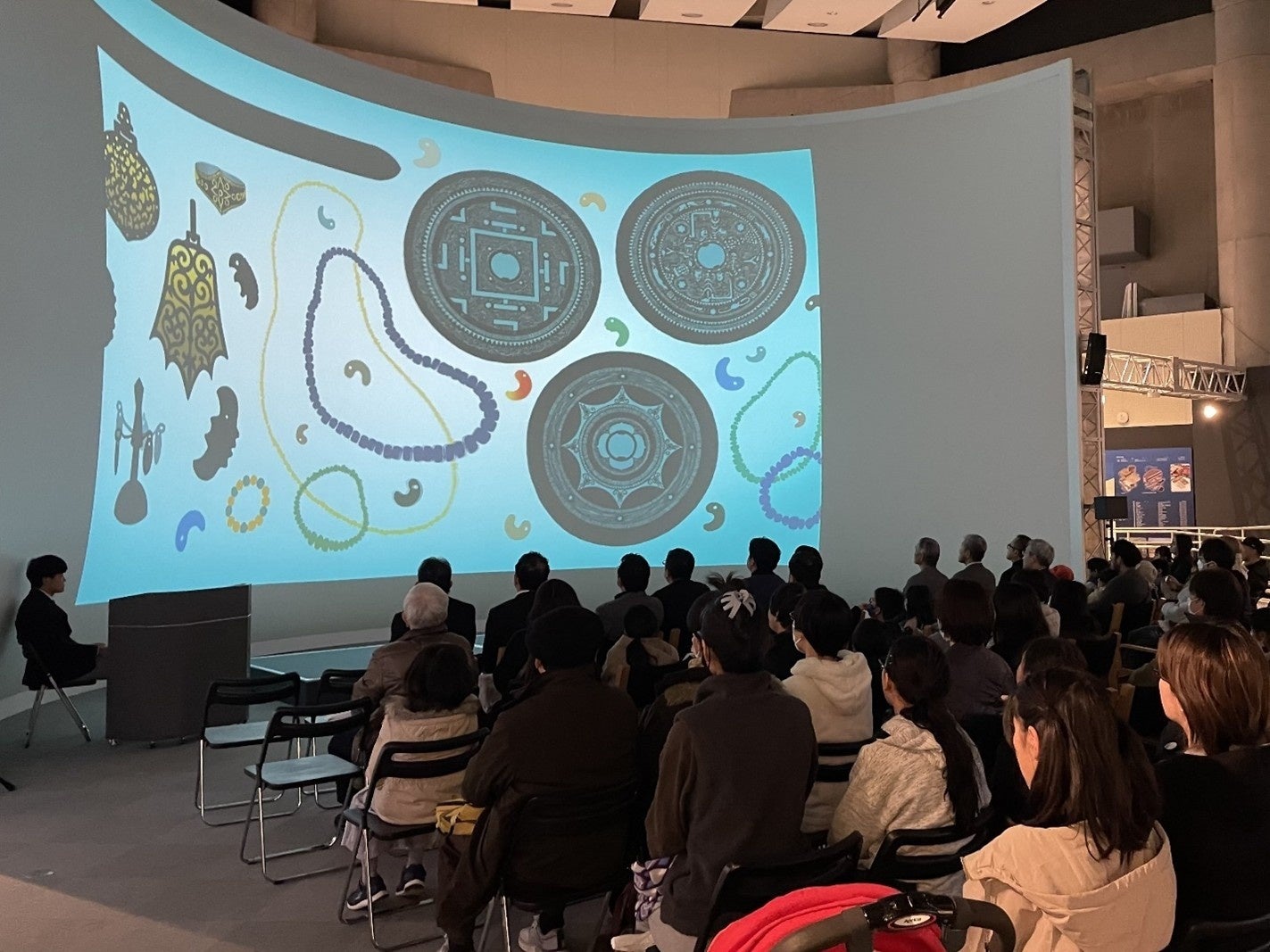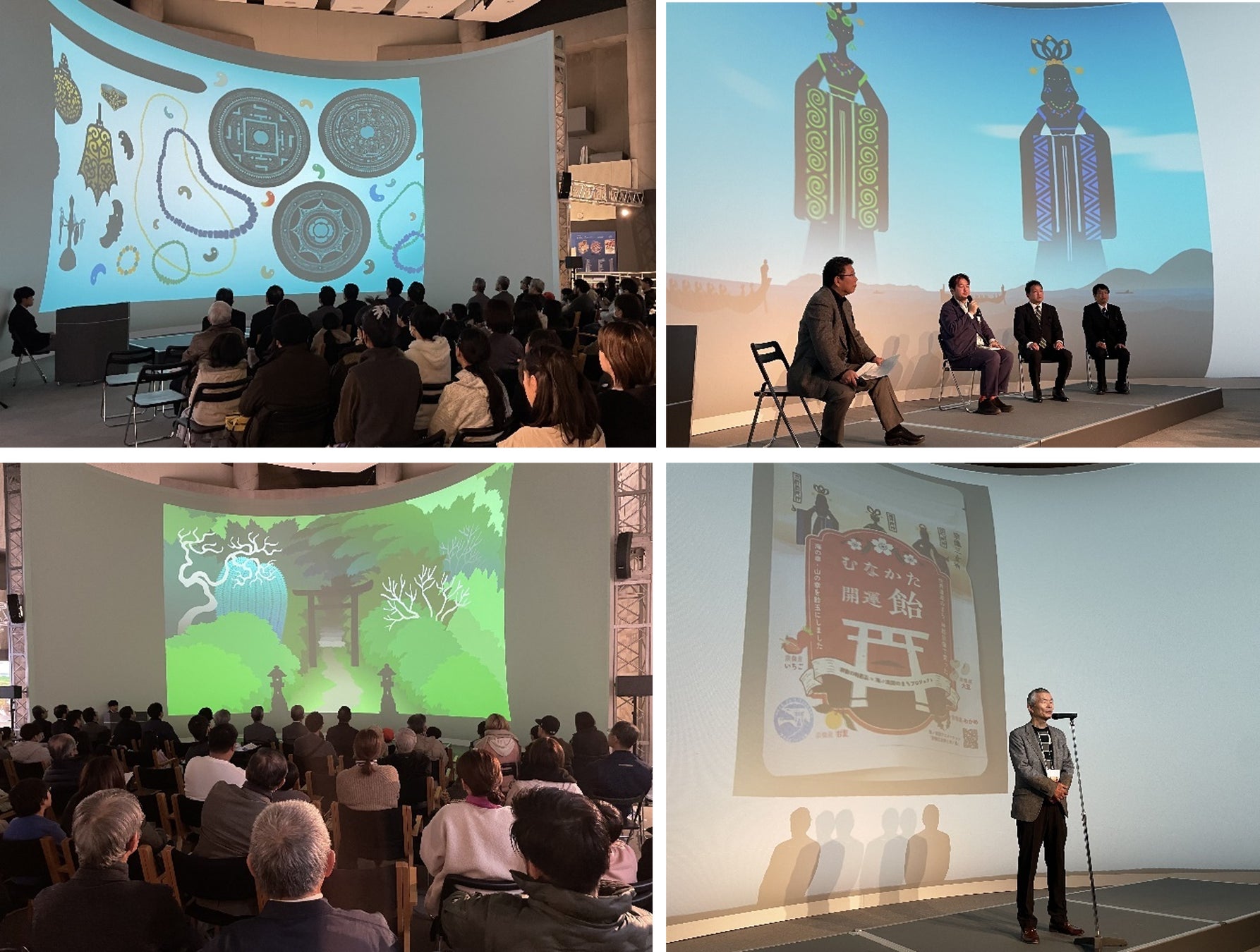 アニメ「宗像三女神と沖ノ島」は、世界遺産「神宿る島」宗像・沖ノ島と関連遺産群と関連の深い神話を題材にしている。そのため、上映会は世界遺産ガイダンス施設「海の道むなかた館」の大型スクリーンで上映することとなった。