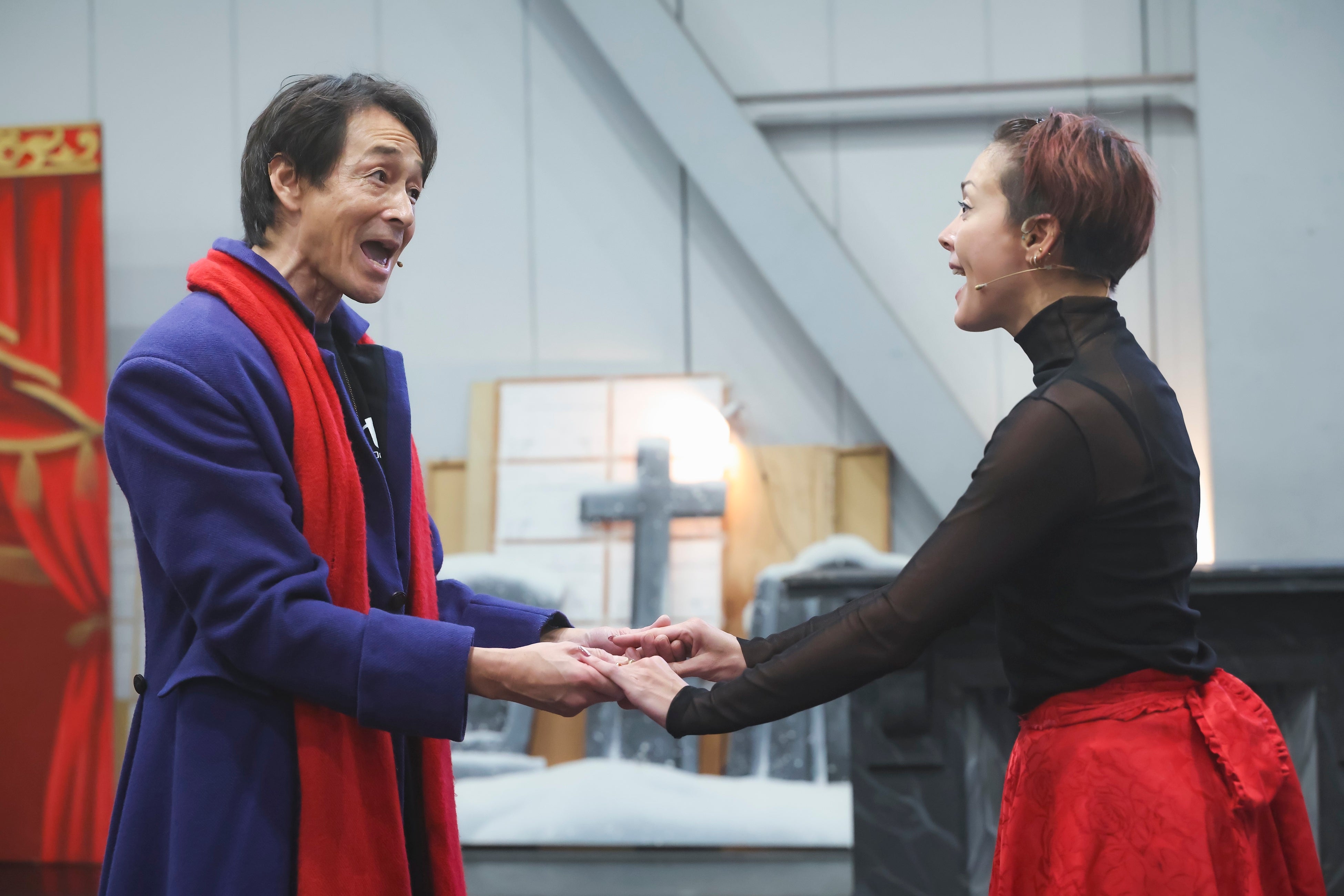 最初に公開されたシーンは、過去のクリスマスの精霊に導かれたスクルージが、青年時代の自分が愛する女性イザベラにプロポーズをする瞬間を見て、若き日の愛情をよみがえらせるシーン。欲ではなく、愛に満ちていたかつての自分を見つめるスクルージの心震える様子を繊細に演じる吉田栄作。土屋アンナの優しく温かな歌声もとても新鮮だ。続いては、時間旅行を終えたスクルージと、吉田要士が扮する親友マーレイが歌うクライマックスのシーンへ。ふたりの絆を感じさせる豊かな歌声が稽古場に響いた。そして全キャストがクリスマスナンバーにのせて歌い踊る楽しいカーテンコールが披露された。