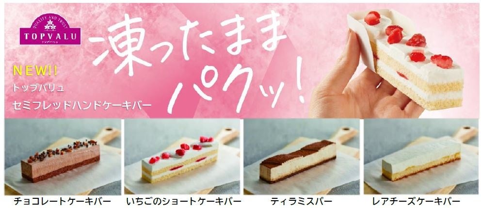 イオンは4月20日(水)より、全国の「イオン」「イオンスタイル」「ダイエー」「マックスバリュ」「KOHYO」等、グループ約2,000店舗(※1)にて、食べたい時に冷凍庫から出して片手ですぐに食べられる「トップバリュ セミフレッドハンドケーキバー」4品目を発売します。