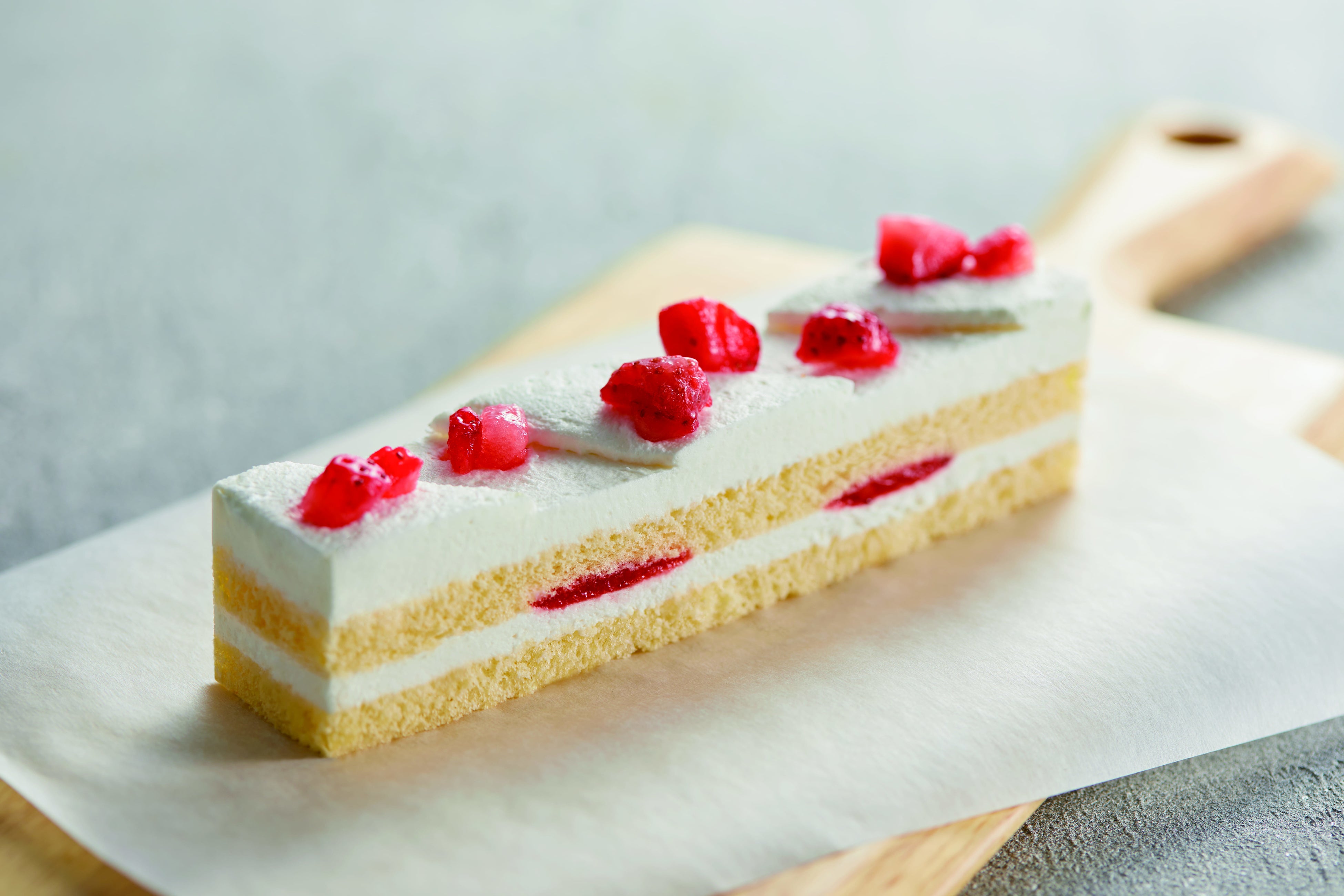 2層スポンジの間にミルク風味のクリームを挟み、アクセントにストロベリーソースをサンドしています。表面には冷凍いちごをトッピングした、定番のいちごケーキです。
