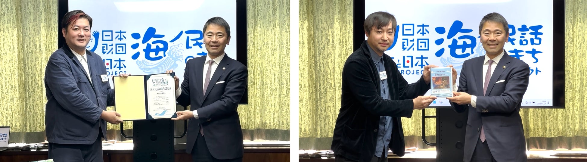 一般社団法人日本昔ばなし協会の沼田心之介代表理事より、松尾崇市長へ海ノ民話のまち認定証を贈呈。その後、沼田友之介アニメ制作プロデューサーより完成アニメDVDパッケージを贈りました。アニメーションは今後、図書館や観光協会等での活用を予定しています。