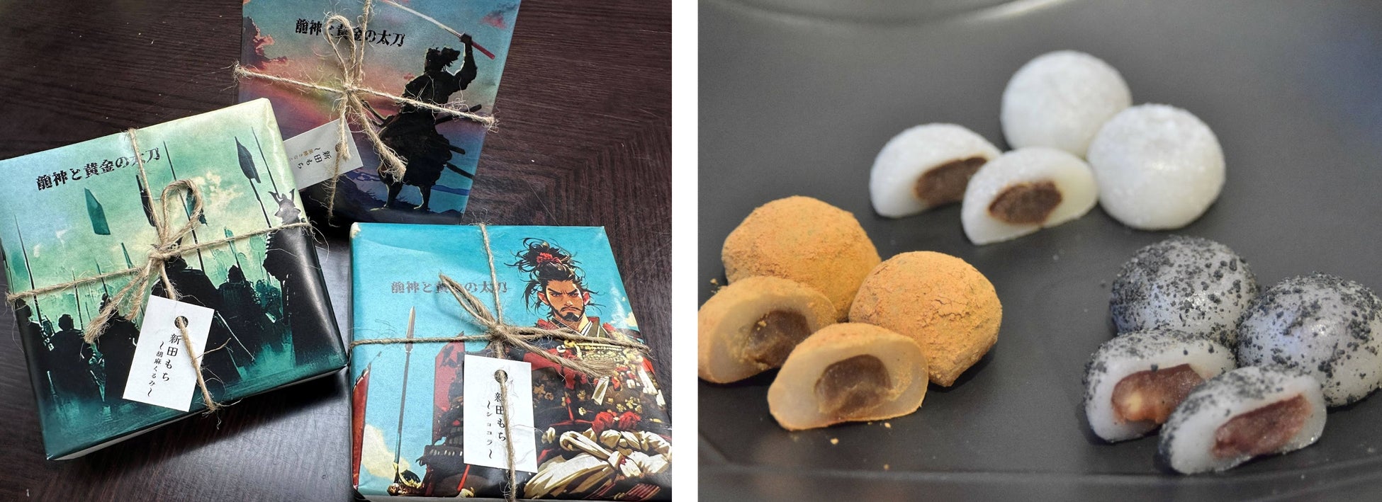 「菓子屋中島」店主の中島隼人氏よりコラボ菓子「新田もち」を紹介。「龍神と黄金の太刀」のストーリーに沿って「出陣:ショコラ味」、「行軍:胡麻くるみ味」、「奇蹟:黒糖きなこ味」の3つの味で表現し、それぞれのシーンに合わせた新田義貞の勇ましい姿をパッケージにデザインしています。ショコラ味を試食をした松尾市長からは「甘すぎず絶妙で、とても美味しい」とコメントをいただきました。「新田もち」は菓子屋中島にて1月23日からの販売を予定しています。