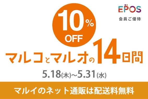 『マルコとマルオの14日間』は、マルイのネット通販「マルイウェブチャネル」および、マルイ・モディ全店にてエポスカードのご利用で10%OFFでお買物いただける会員ご優待キャンペーンです。「マルイウェブチャネル」では、日傘やUV対策コスメ、夏の新作ファッションなど、夏準備グッズもおトクに手に入れる絶好のチャンスとなっています。