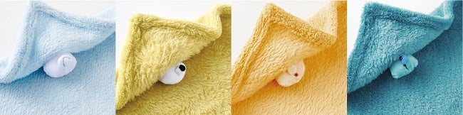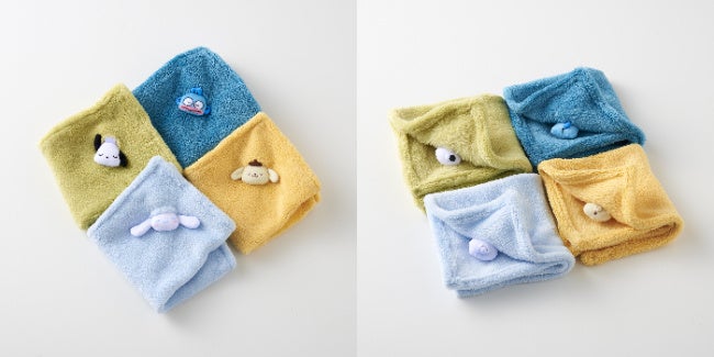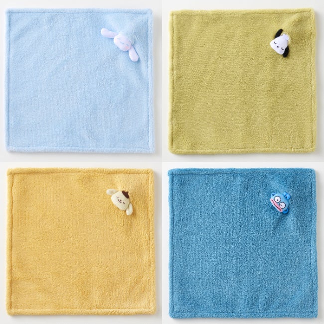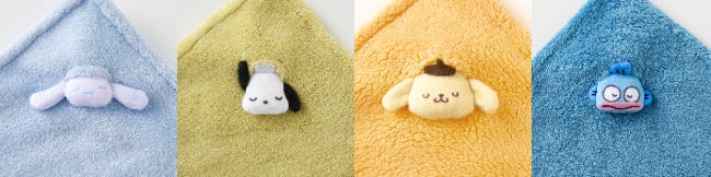 デザインは〈シナモロール〉〈ポチャッコ〉〈ポムポムプリン〉〈ハンギョドン〉の人気キャラクター4種類です。ふわふわな素材のハンカチなので、キャラクターたちがまるで本物の毛布にくるまって眠っているように見えます。
