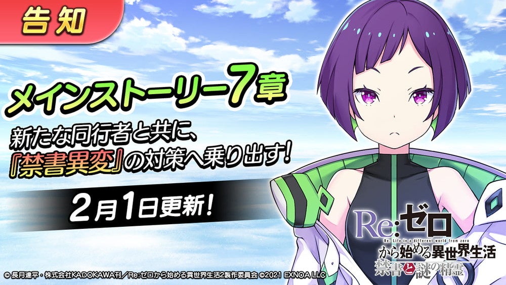 合同会社EXNOA(本社:東京都港区、CEO:村中 悠介、URL:https://games.dmm.com/)が運営するDMM GAMESにおいて配信中のPC・Androidゲーム『Re:ゼロから始める異世界生活 禁書と謎の精霊』にて、2月1日(火)にアップデートを実施したことをお知らせいたします。詳細はゲームページのお知らせを御覧ください。