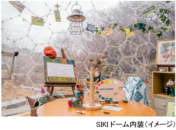 ドーム内からフラワーシーズンの「SIKIガーデン~音の散策路~」の風景を眺めたり、備え付けのオルゴールやカリンバ、オタマトーンなどの楽器の演奏体験やボードゲームや本を楽しんだりと、思い思いののんびりした時間が過ごせます。当プランでは、芸術家の憩いの場をイメージし、インテリアや塗り絵などを設えています。