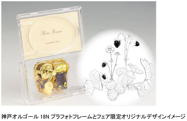 当フェア期間中の限定オリジナルデザインです。六甲山でも春に見られるワイルドストロベリーをイメージし、デザインしました。演奏中のオルゴールの動きも楽しめます。フォトフレームのクリア面にレーザー彫刻を施しています。