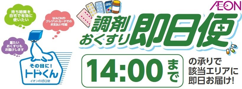 イオンリテールは4月21日(木)から、「イオンマリンピア店」(千葉市美浜区)の「イオン薬局」にて、薬剤師が調剤した薬を当日中にお届けする宅配サービス「その日に!トドくん調剤おくすり即日便」を開始します。