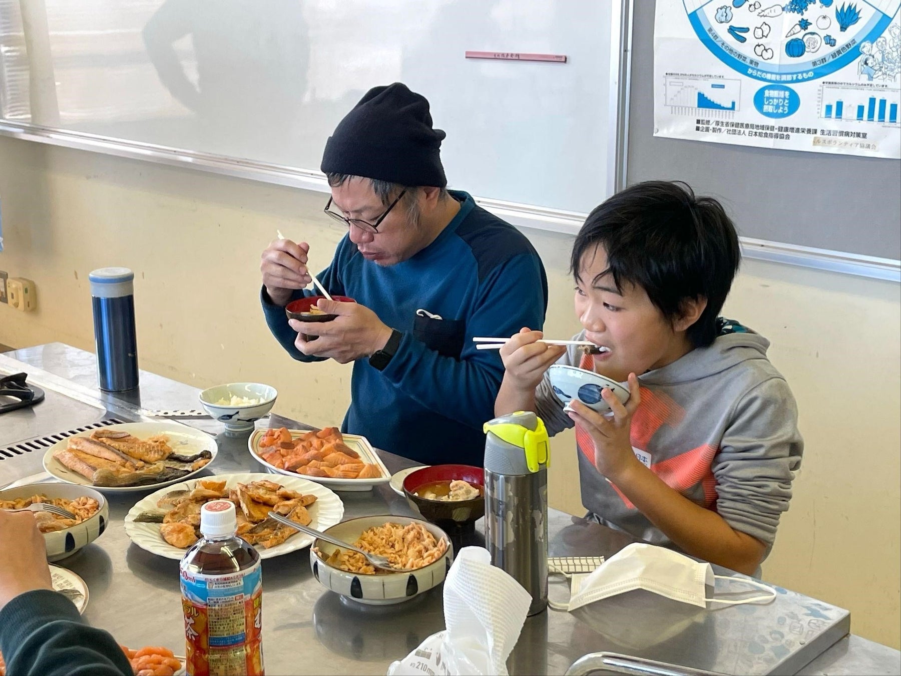③参加児童がいみずサクラマスをさばき、料理に挑戦。親子で試食