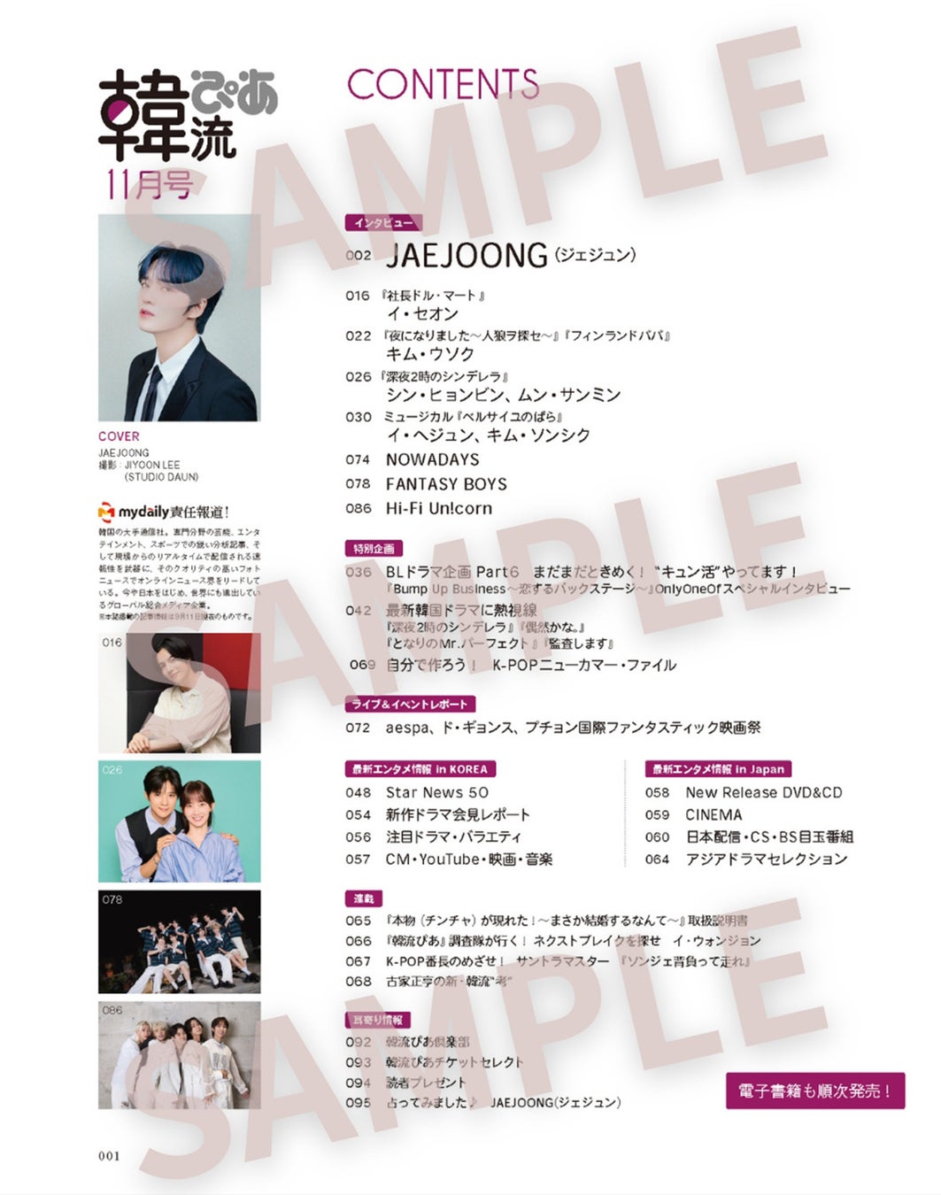 そのほか、『社長ドル・マート』のイ・セオン、『夜になりました~人狼ヲ探セ~』『フィンランドパパ』のキム・ウソク、『深夜2時のシンデレラ』シン・ヒョンビン、ムン・サンミン、そして11月9日に日本でコンサートを行うことが決定しているミュージカル俳優イ・ヘジュン&キム・ソンシク、K-POP第5世代注目のアーティストNOWADAYSのインタビューを掲載。