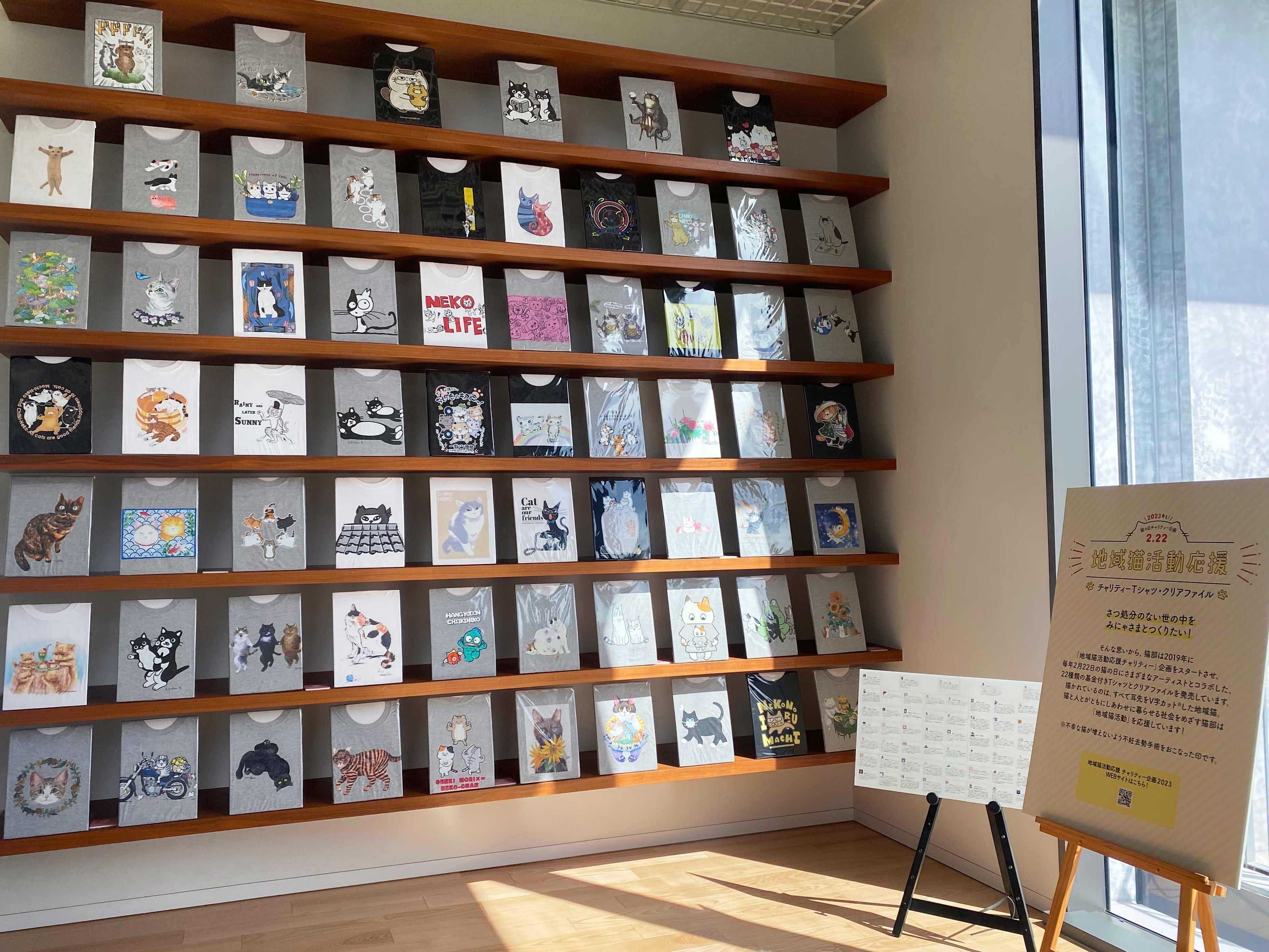 2019年から毎年2月22日の猫の日に発売している、「地域猫活動応援チャリティー企画」の過去3年分のTシャツ、全66種を展示しています。猫部の活動に賛同する、各界のアーティストが制作したアートがデザインされています。描かれているのは、すべて耳先をV字カット(※)した猫です。
