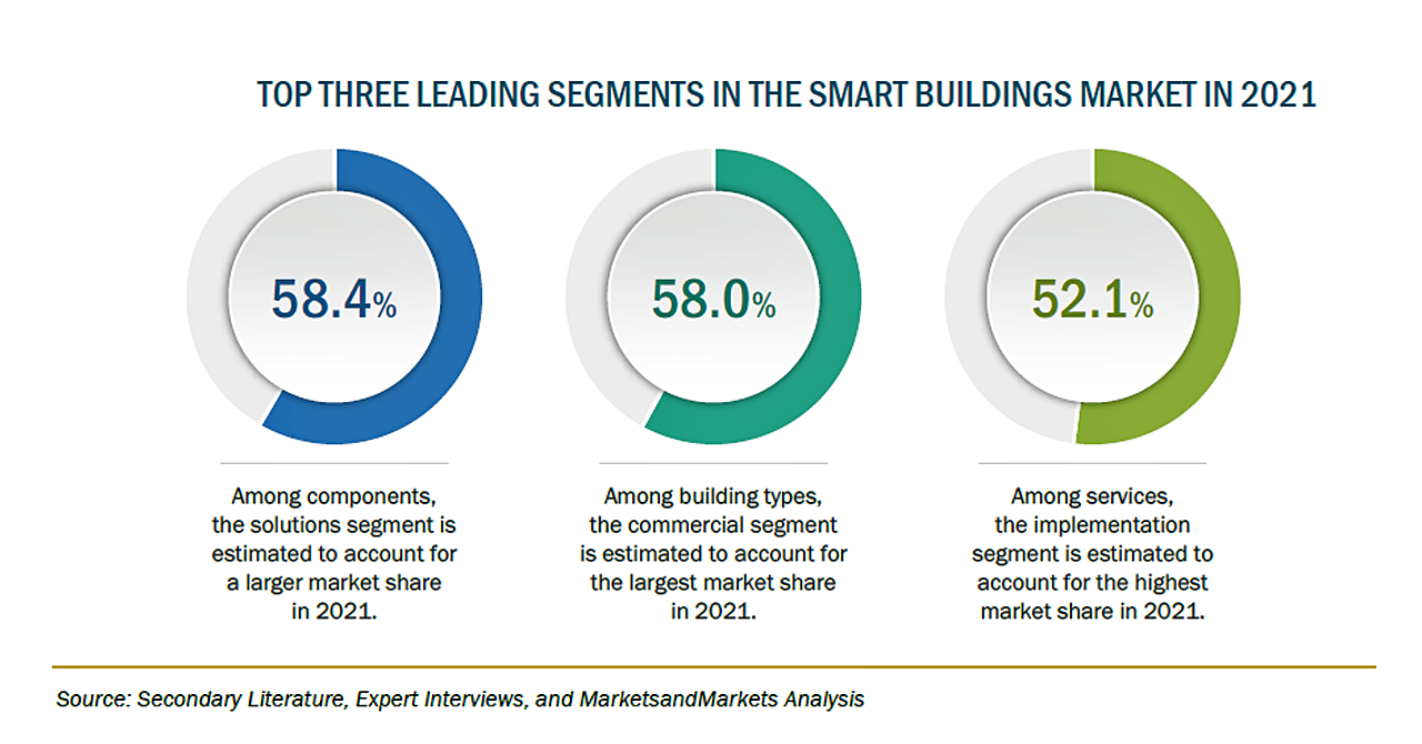 スマートビルディングの市場規模は、2021年の726億米ドルからCAGR10.9%で成長し、2026年には1,216億米ドルに達すると予測されています。エネルギー効率の高いシステムに対する需要の高まり、IoT対応BMS(ビル・マネジメントシステム)の採用増加、業界標準や規制の強化など、さまざまな要因がスマートビルディングのソリューションやサービスの採用を促進すると予測されます。