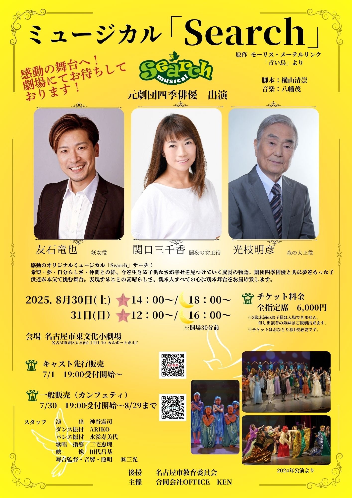 2017年初演、名古屋発信となるミュージカル「Search」は子供たちの舞台に立つ夢を叶えるため、Searchをきっかけに羽ばたいて進んで行くことを応援しています。また多くの方に感動を与えられる作品として話題になっています。2024年コロナ禍を経て再演も大盛況で幕を閉じることができました。