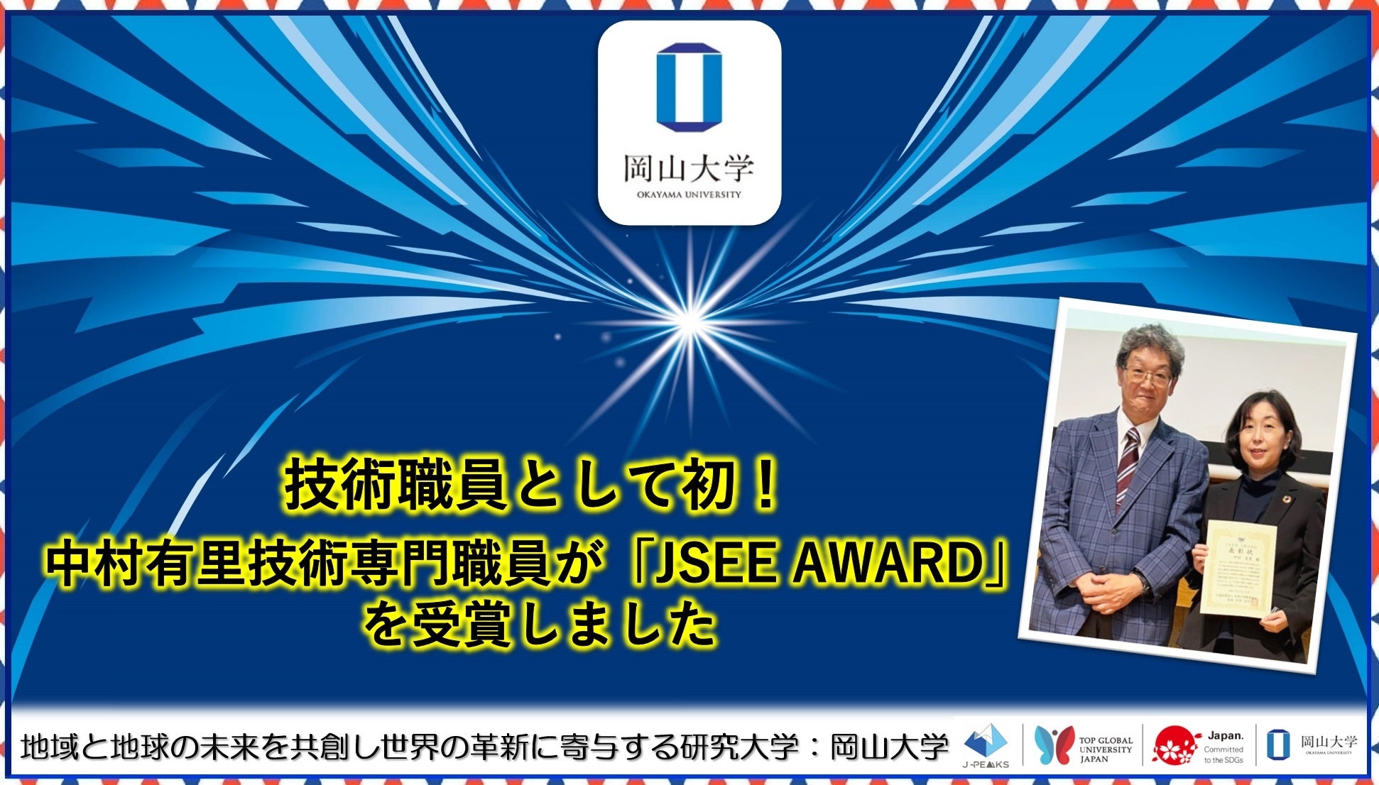 国立大学法人岡山大学(本部:岡山市北区、学長:那須保友)の総合技術部教育支援技術課の中村有里技術専門職員が2025年6月13日、「JSEE AWARD」を受賞しました。
