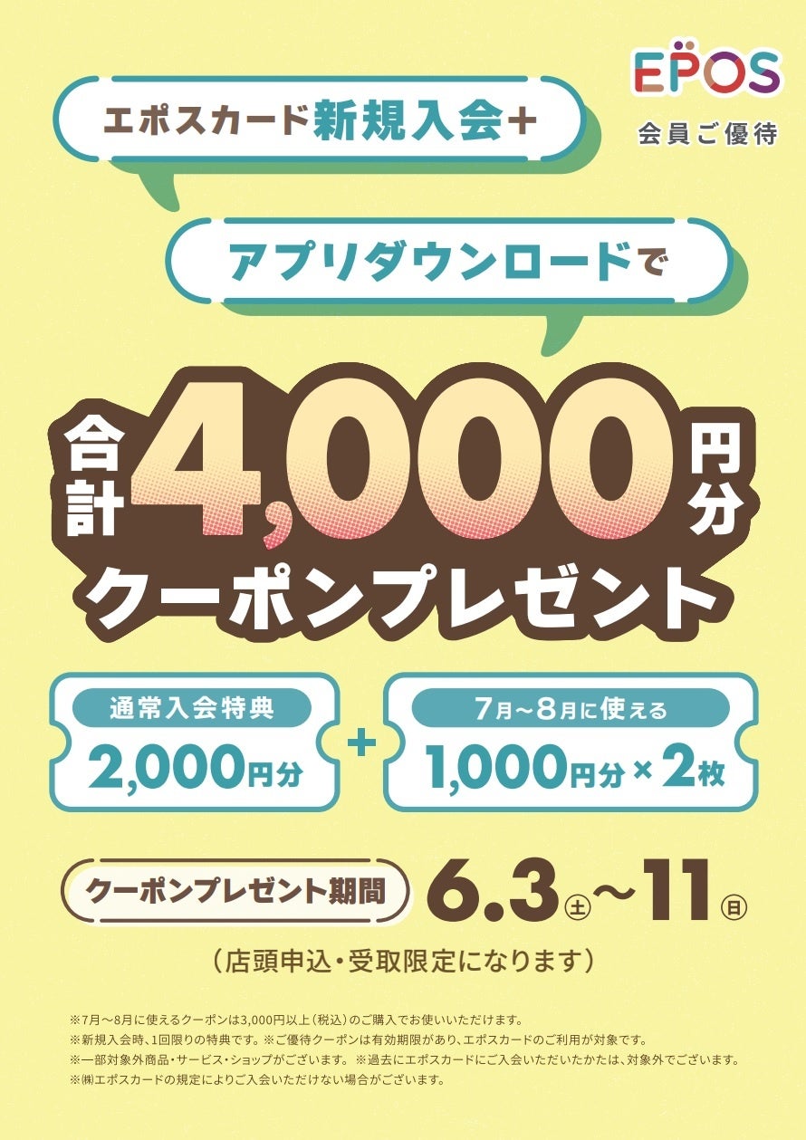 エポスカードをお持ちでないお客さまは、当日までに新規ご入会いただくと5%ポイントバックの対象となります。6月3日(土)~6月11日(日)に「新規ご入会+アプリダウンロード」をしていただくと、通常入会特典の2,000円分クーポンに加え、2023年7月1日(土)~8月31日(木)にご利用いただける1,000円分×2枚のクーポンをプレゼントいたします。