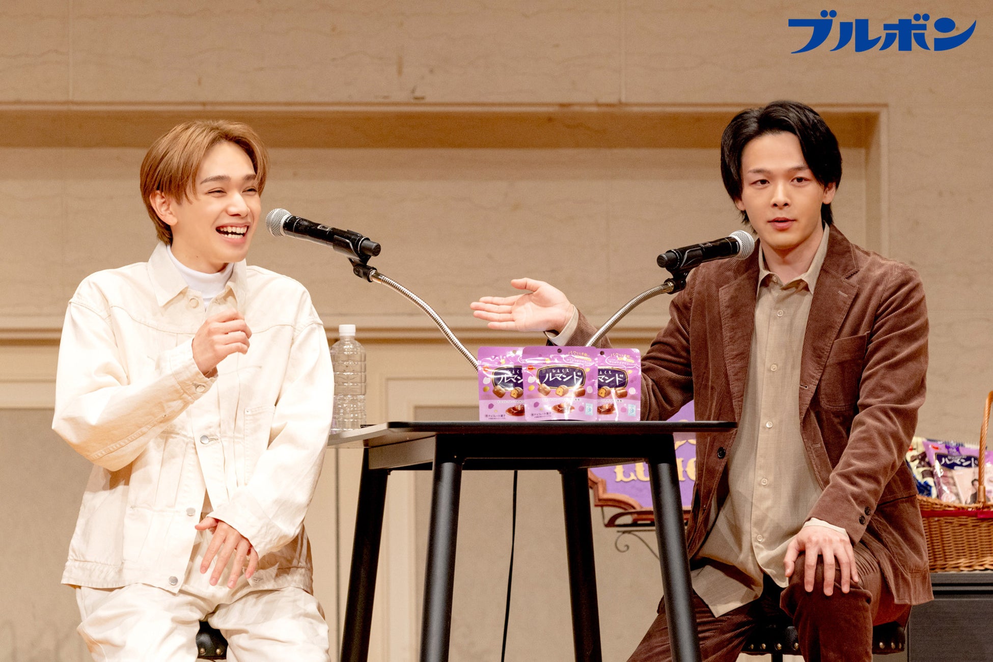 互いの第一印象を尋ねられ、まだ宮世が17歳の頃、ドラマの現場で初めて会った頃の印象をそれぞれ回答。「僕がまだお芝居の経験がなかったので、付き合い方も含め、いろいろ教えてくださった優しい先輩です」という宮世に、中村は「かわいい子と思いました」と言いながら、当時の宮世のあるエピソードを紹介しました。ルマンドのCMの設定“叔父と甥”の関係にちなんだ質問では、中村は「僕の世代は一般社会では中間管理職っていうんですかね、30歳を超えてから一気に下の世代が出てきて、最初はどう接したらいいか分からなかったですが、今はとても愛おしく思える。自分が若かった頃にいてくれたらありがたかったような存在でありたいなって思います」と答え、さらに宮世が中村に定期的に行っているという、ある特殊なアプローチの話題も飛び出しました。他に、今2人が行ってみたい場所や好きな映画などについてもトーク。