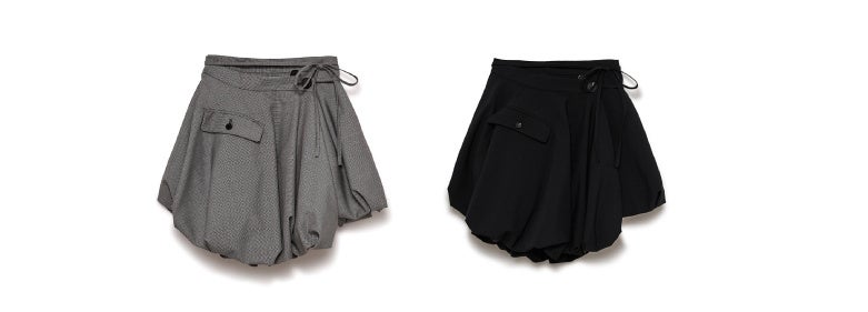 メンズライクなスーツ素材を使用した、甘すぎないバルーンシルエットのラップスカート。One Shoulder Tailored Jacketと同素材を採用しているため、セットアップ着用もおすすめです。
