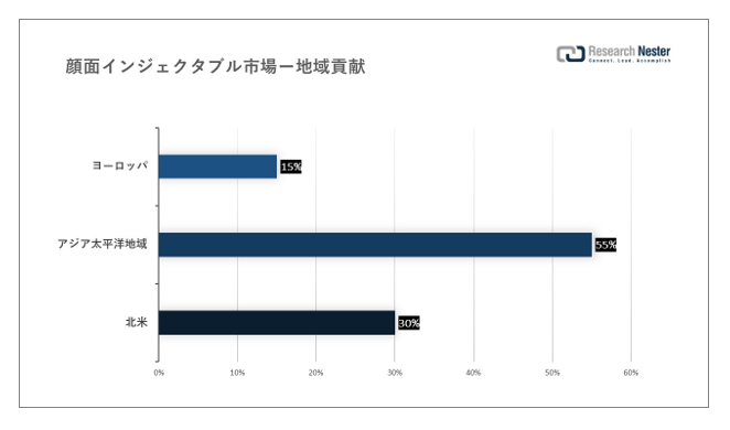 アジア太平洋地域の顔面インジェクタブル市場は、他のすべての地域の市場の中で、2033年末までに最大の市場シェアを占めると予測されています。同市場の成長は、同地域における可処分所得の増加、美容整形への高い支出、外見に関する意識の高まり、美容基準の上昇などが主な要因として挙げられます。また、あらゆる年齢層から顔の輪郭を強調するような美容整形に対する強い需要があり、人口の急増も市場拡大の好材料になると予想されます。さらに、この地域の主要な主要プレーヤーの存在とその新製品の発売により、皮膚科および美容クリニックでの顔面インジェクタブルに対する強い需要が生まれると予想されます。