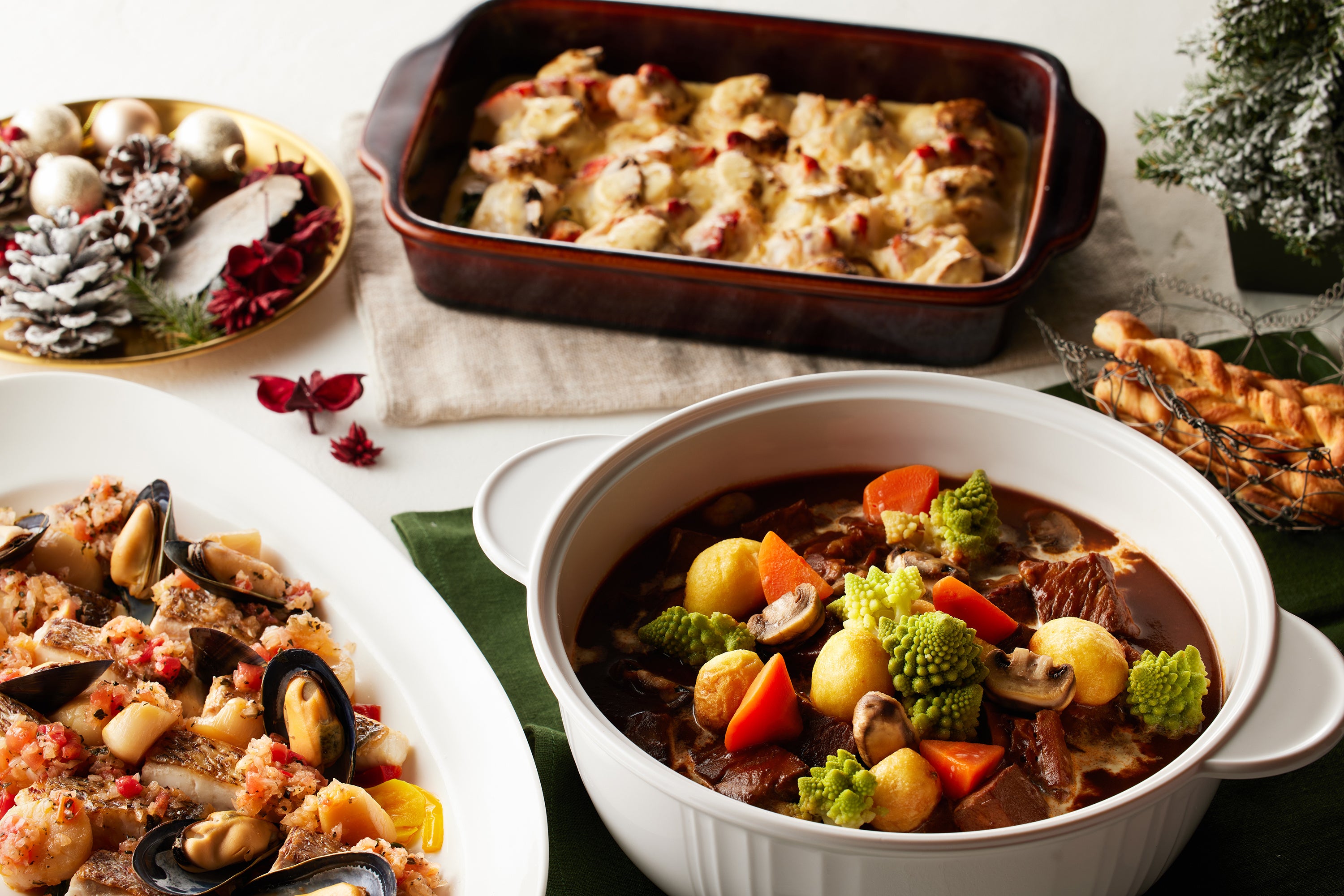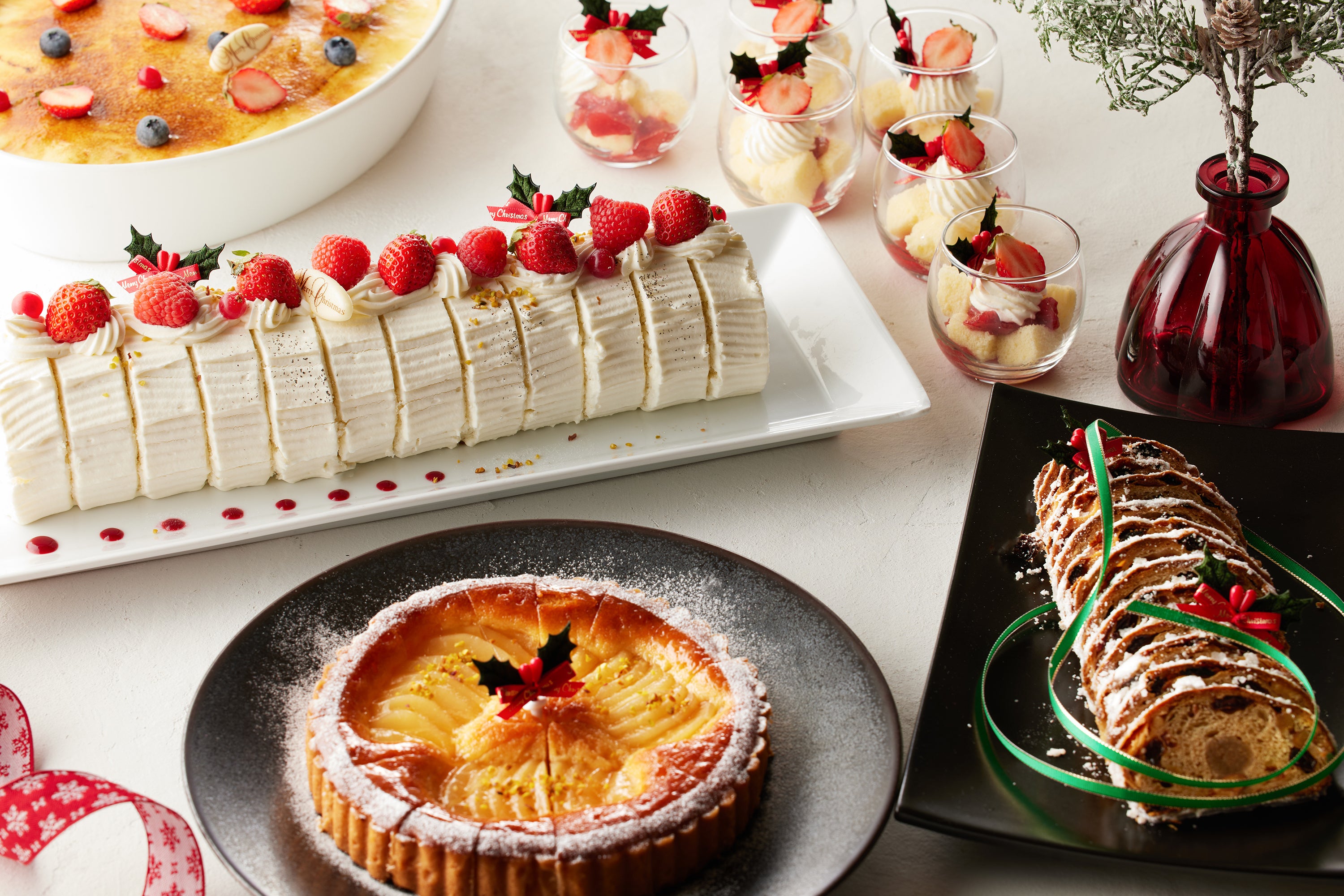 デザートは、いちごのゼリーとなめらかな生クリームを、しっとり焼き上げたスポンジでロールした「ノエルフレーズ」、バターをたっぷり使った生地にドライフルーツやナッツを合わせた「シュトーレン」など、クリスマスにぴったりなスイーツをお楽しみいただけます。また、風味豊かなアーモンドクリームの上に洋ナシを並べ焼き上げた「ポワールタルト」や、フランスで古くから愛される「フルーツグラタン」など、フルーツを使用した冬にぴったりなデザートもご用意しています。