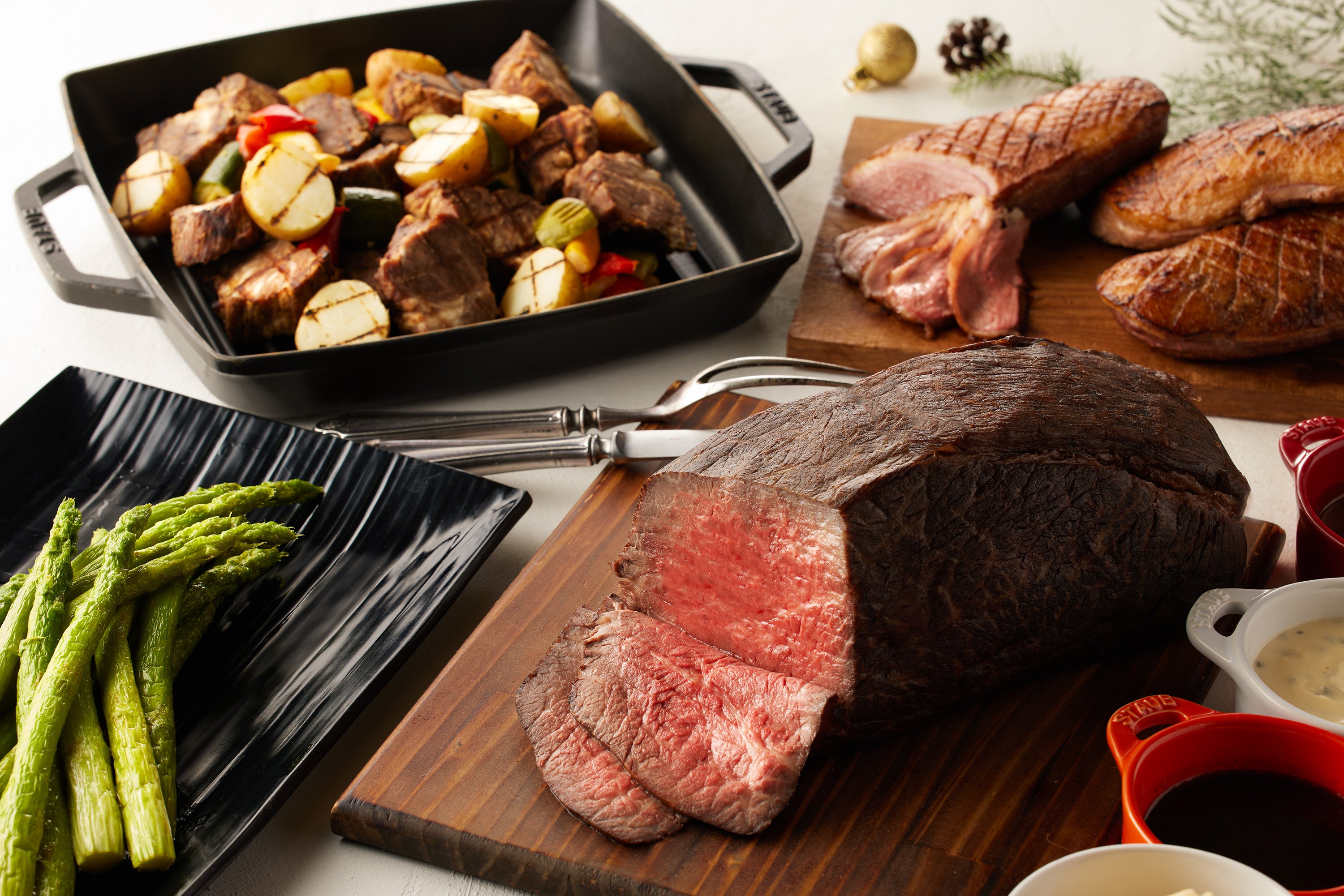 シェフサービスでは「フランス産マグレカナールのポワレ&和牛もも肉のローストビーフ」は、深い旨味と繊細な脂の甘さが特徴の鴨胸肉として知られるマグレカナールと、口どけが良く赤身と脂身のバランスが絶妙な和牛ローストビーフを贅沢にご堪能いただけます。トリュフ入りクリーミーマッシュポテトとコク深いフォアグラ入り赤ワインソースと共にお楽しみください。前菜の「帆立とカブのカルパッチョ キャビア添え」は、高級食材であるキャビアを添え、贅沢に仕上げています。またじっくり煮込むことでホロっと柔らかい食感に仕上げた「牛肉の赤ワイン煮ブルギニヨン風 チーズパイ添え」はフランス・ブルゴーニュ地方の郷土料理で、身も心も温まる至福の味わいです。