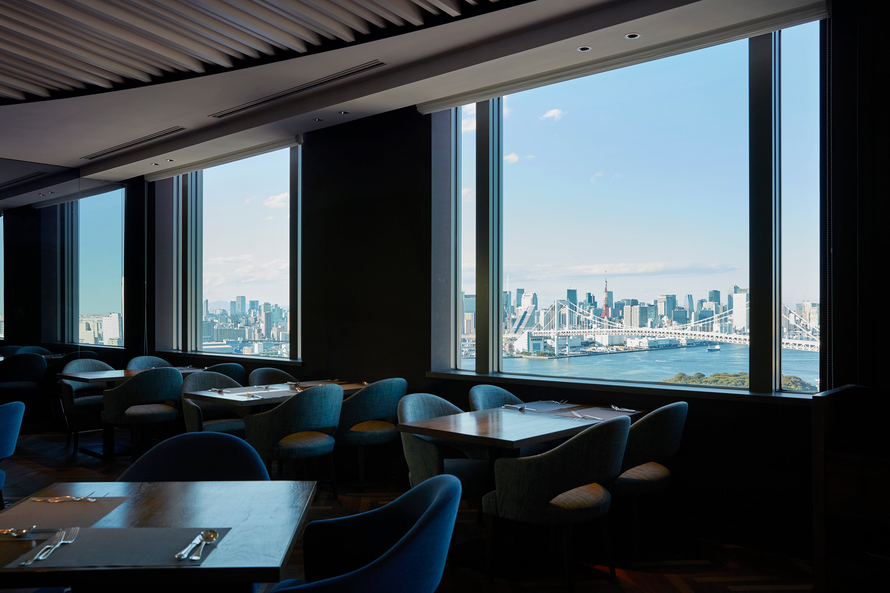 レインボーブリッジを越えればそこは日常を離れた別世界。陽の光に輝く水面と青く澄みわたる風、心弾む特別な時がはじまります。高層階のレストラン、ゲストルームからは東京湾のパノラマビューが見渡せ、海の向こうには表情豊かな東京の街が広がります。大切にしたのは「晴れやかな気持ちで笑顔あふれるひとときを」という思い。心がほどけていくような喜びに満ちた体験をお届けします。