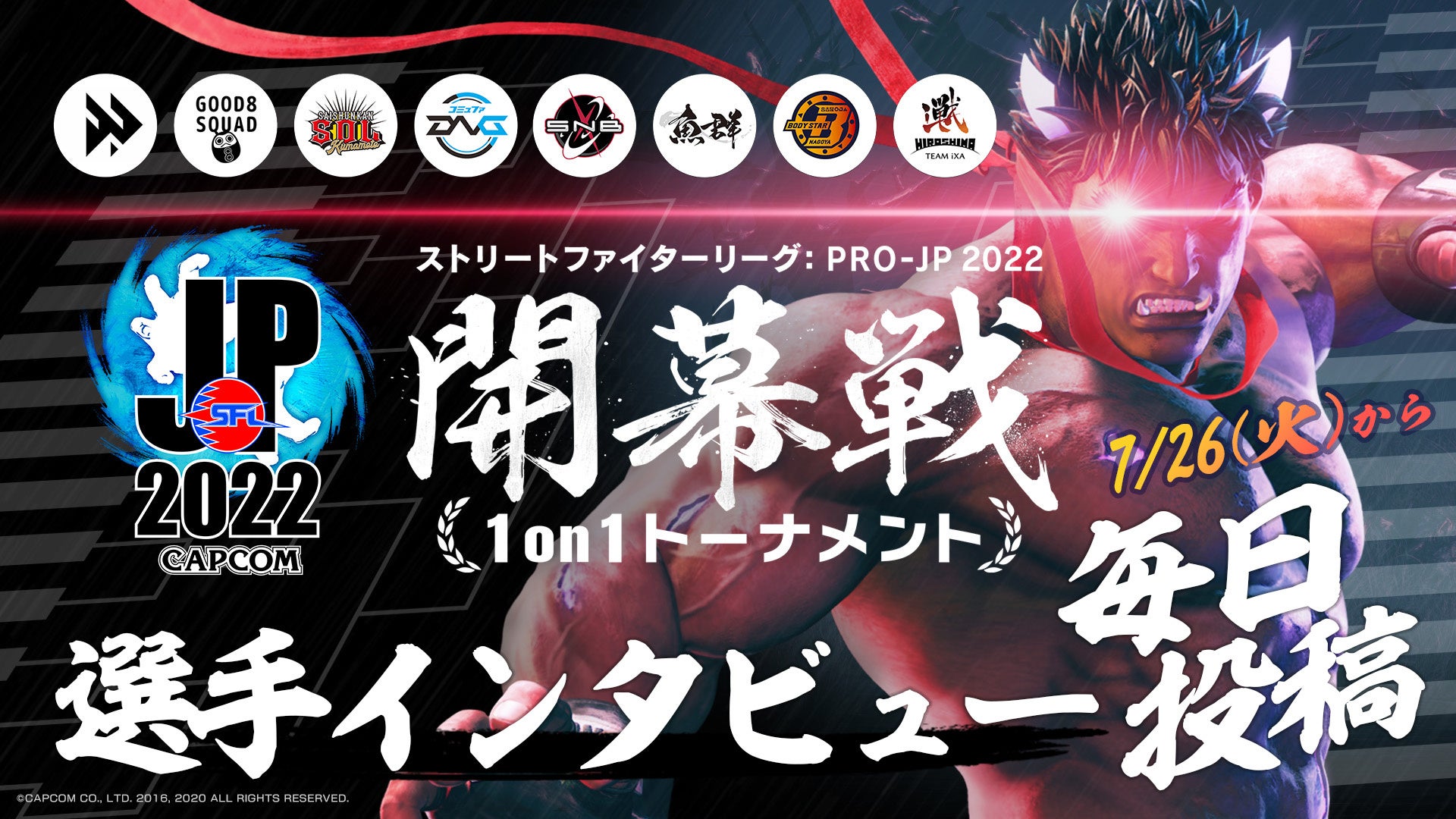 8/27(土)-28(日)に開催する「ストリートファイターリーグ: Pro-JP 2022 開幕戦 1on1トーナメント」に向けて、出場する全32名の選手の意気込みインタビュー動画を7/26(火)から毎日投稿します!