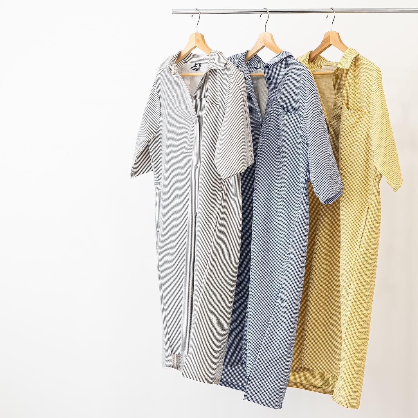 爽やかなサッカー素材のシャツワンピース。背中のベンチレーションも蒸れにくいポイントです。カラー展開も豊富で、色違いで揃えたくなるワンピースです。