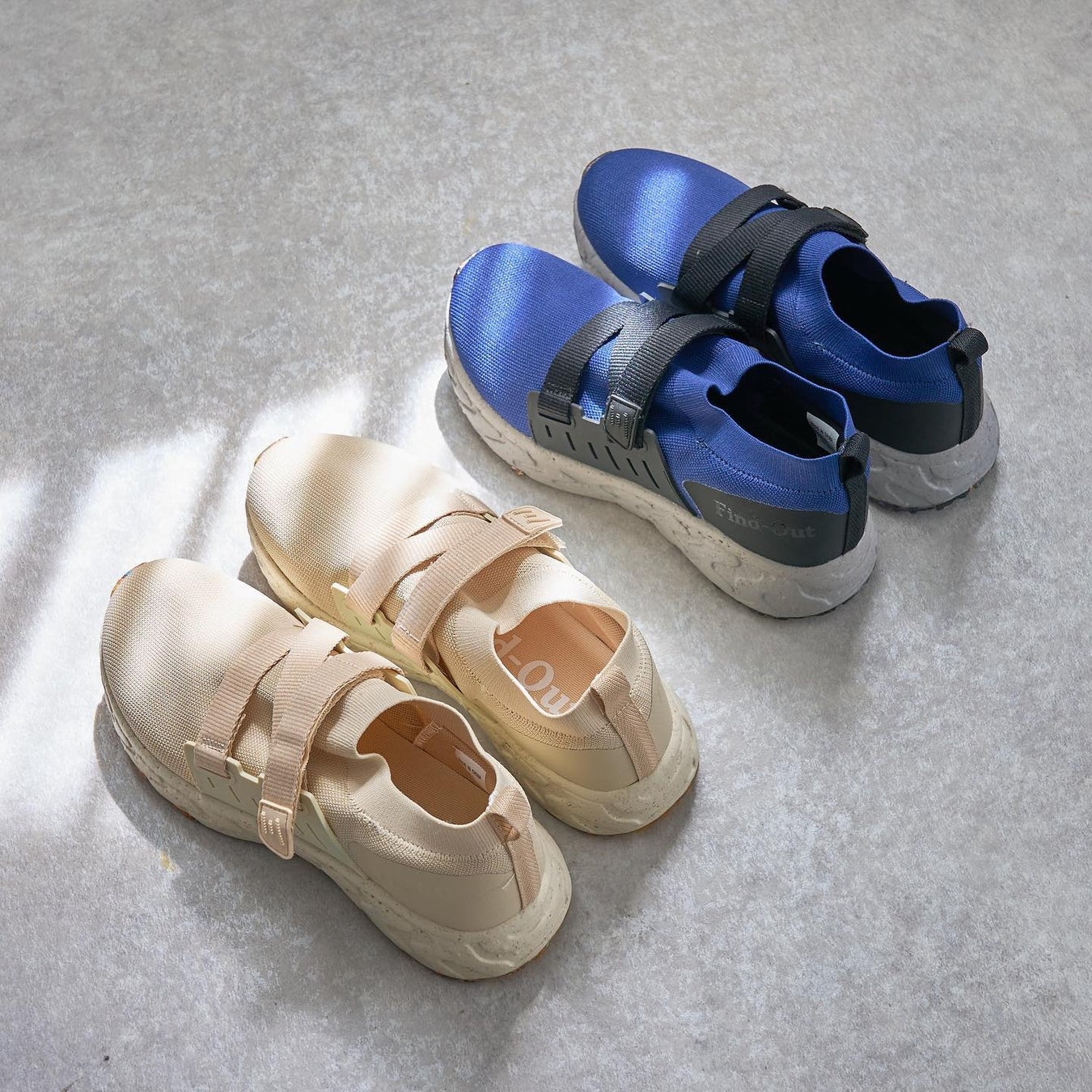 軽やかなニット素材のアッパーには、リサイクル糸を使用。アッパーの上にはファスナーのベルトが足をしっかりホールドしてくれます。靴底のカラフルな合成ソールもぜひチェックしてみてください。