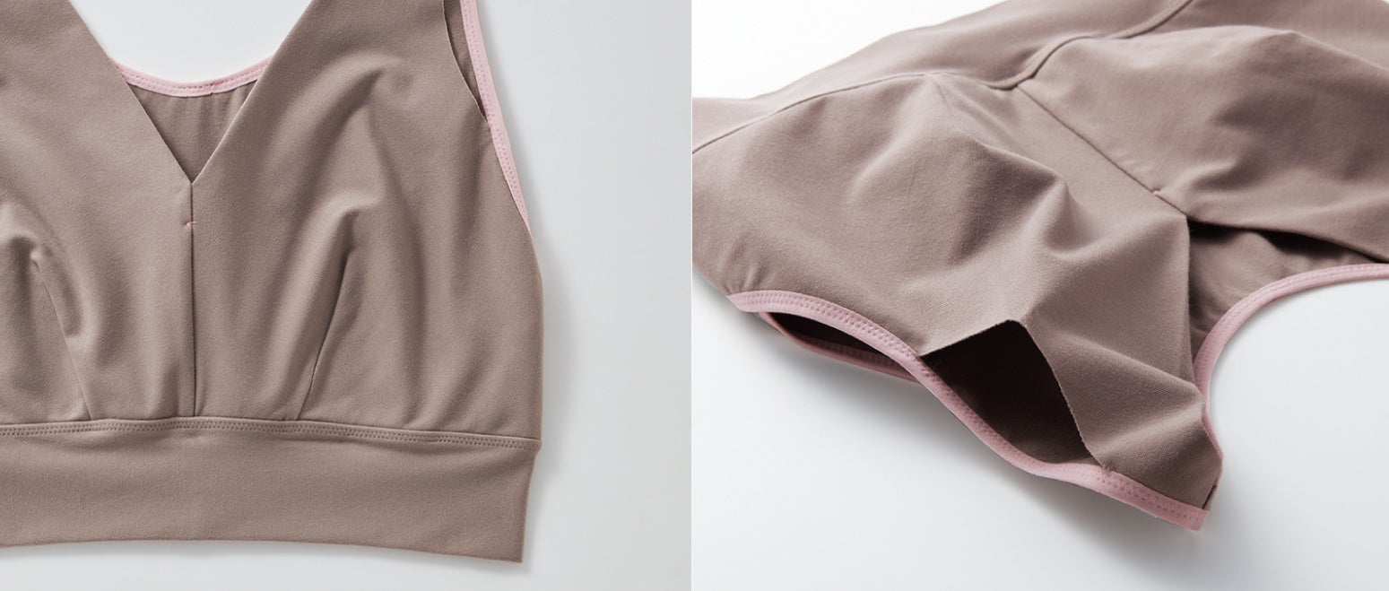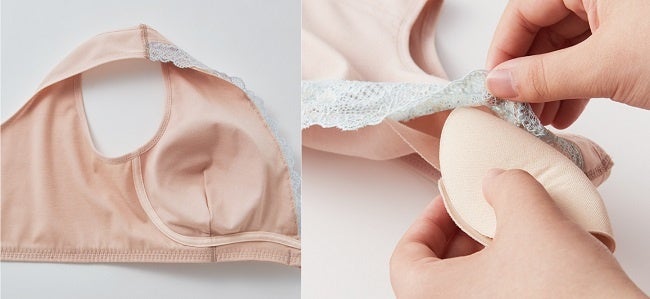 縫い目やゴムなどは肌がチクチクしないよう、できるかぎり外側に。洗濯ネームも肌に当たらないように工夫されています。カップポケットは外付けタイプで、レースと身生地の間から入れられる仕様になっています。出し入れがらくで肌当たりも◎です。
