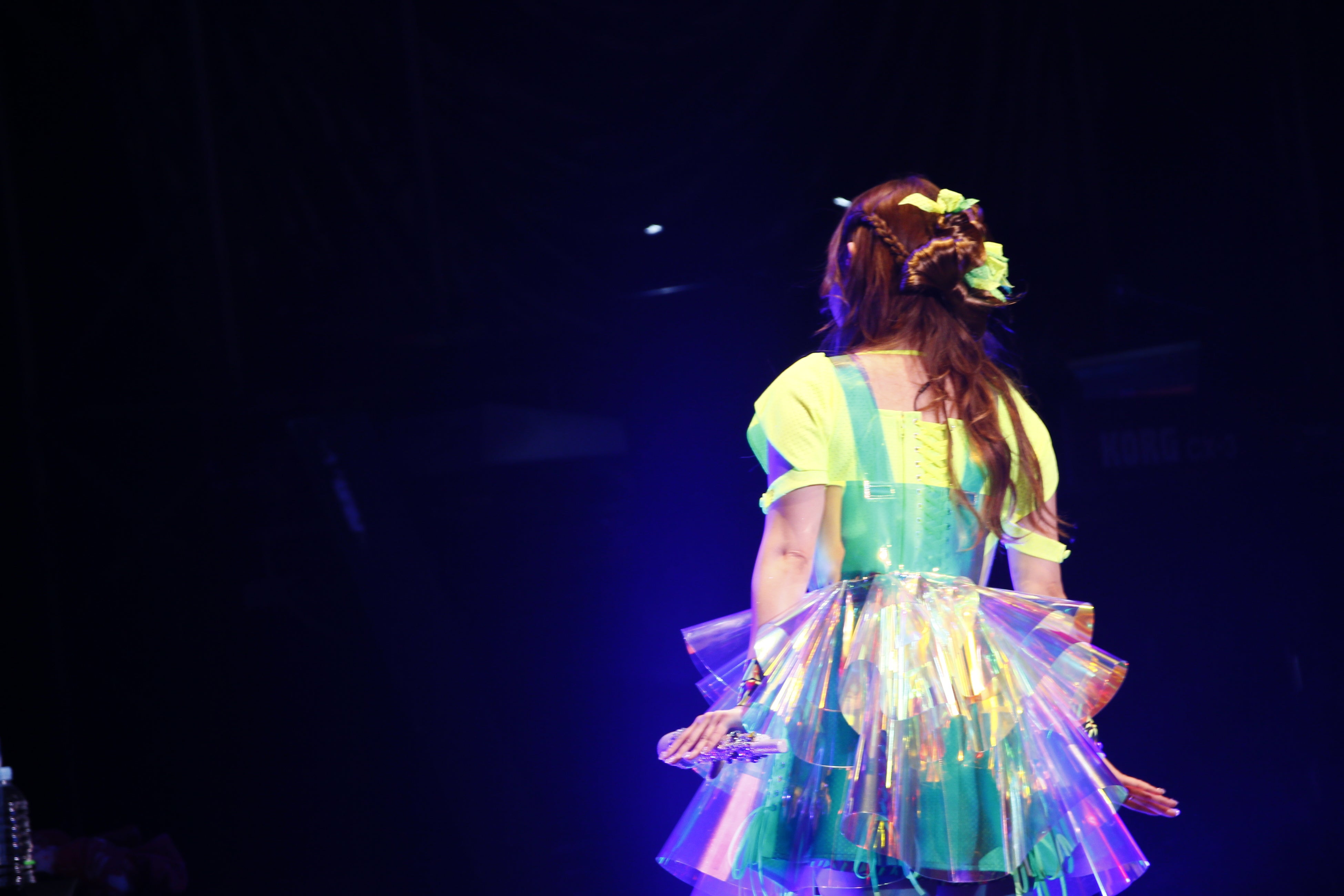 オープニングSEにあわせて、お客さんの手拍子とともに中川が登場。今回の衣装は本人プロデュース。蛍光のレースと編み込みを組み合わせたスポーティな雰囲気で、スカート部分はPVC素材を使用しており照明の当たり方や見る角度によって違った表情を見せる今回のバースデーライブ特別仕様となっている。
