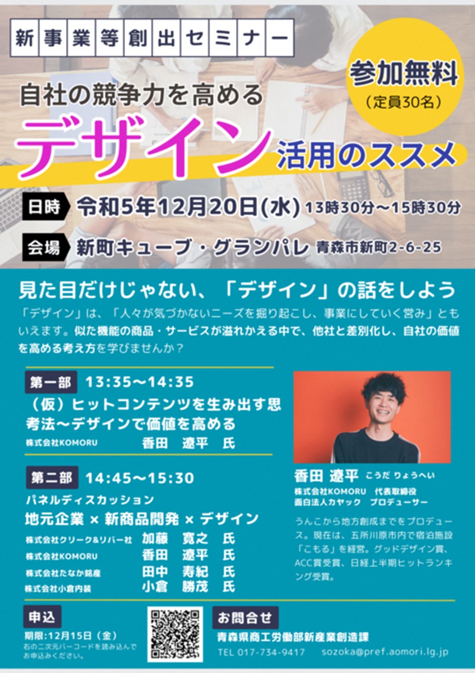 12/20(水)青森県の令和5年度新事業等創出セミナーに当社プロデューサーが登壇~「自社の競争力を高めるデザイン活用のススメ」のパネルディスカッションで~