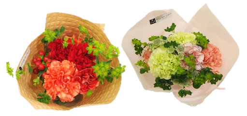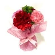 母の日ギフトに人気のカーネーションのブーケです。ご要望に応じてお作りします。また、花瓶が無くても、そのまま置いて飾れるスタンディングブーケなども用意します。