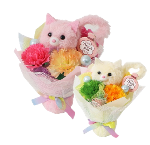 “アーティフィシャルフラワー”は、そのまま飾れ手入れも不要なので、贈り物として近年人気が高まっています。この度は、母の日向けギフトとして、「ソープフラワーベアブーケスタンド」「虹色フワ猫ブーケ」などを用意します。