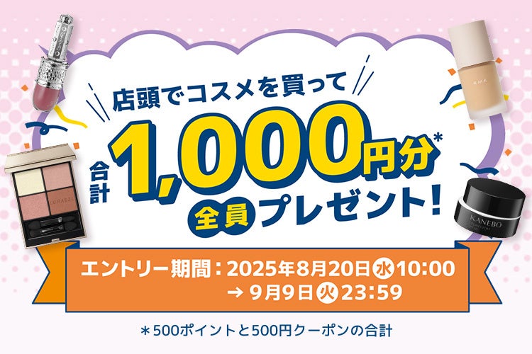 店頭でコスメを買うと、全員に合計1,000円分をプレゼント!