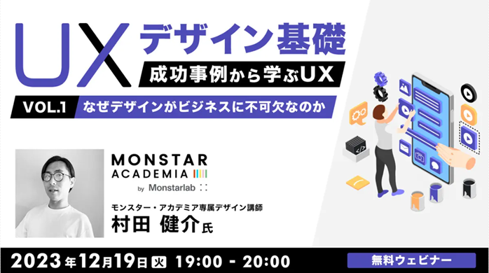 そこで本セミナーシリーズでは、モンスター・アカデミア専属デザイン講師の村田健介氏をお招きし、UXデザインを基礎から学んでいきます。