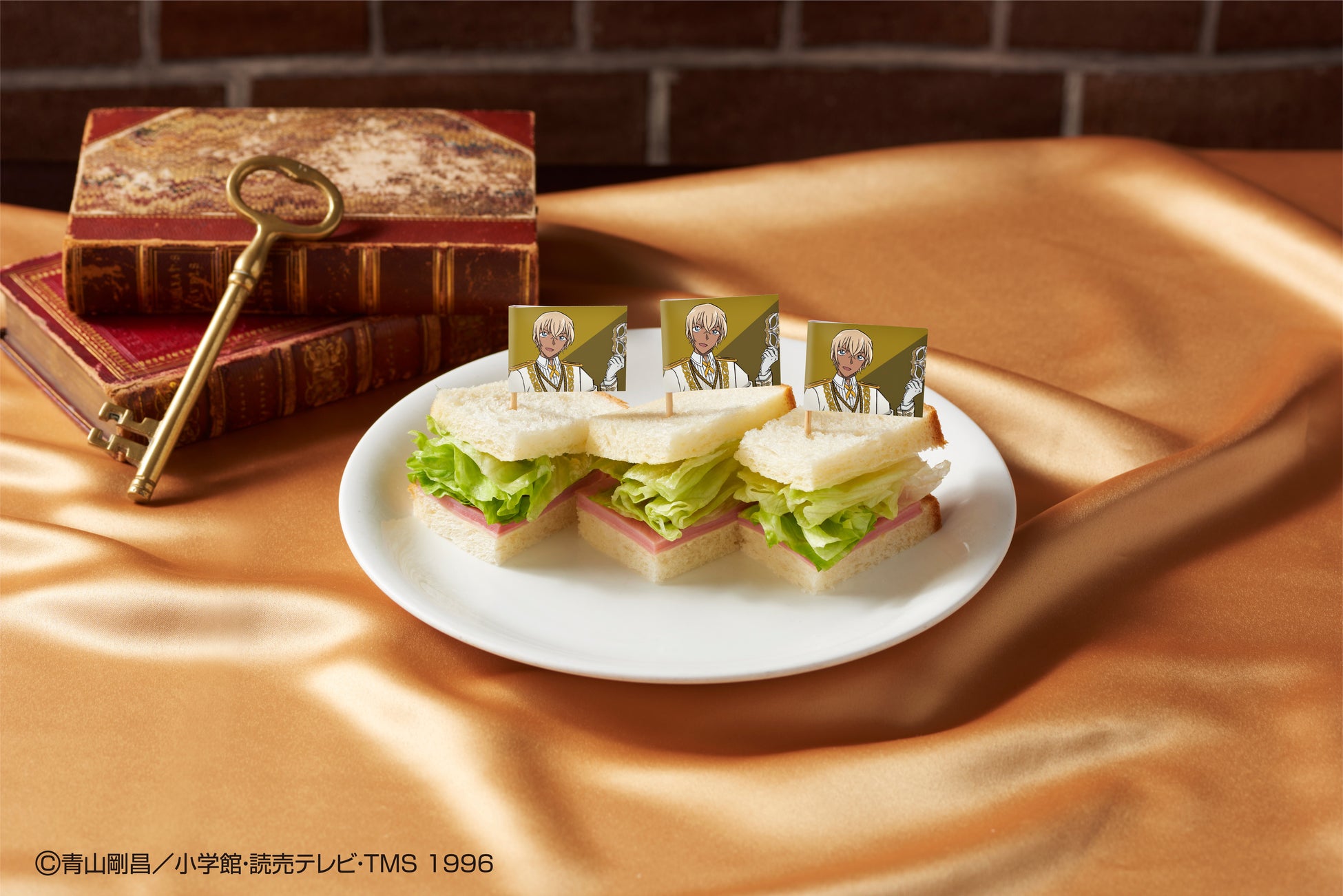 江戸川コナンの蝶ネクタイ型変声機をモチーフに、いちごをアクセントにあしらった「江戸川コナンのストロベリーショートケーキ」、安室透のアルバイト先“喫茶ポアロ”のレシピをもとにした「安室透のハムサンドウィッチ」、怪盗キッドをイメージした「怪盗キッドのブランケット・ドゥ・プーレ」をはじめ、APTX4869を口にしたような刺激を想起させるスパイシーで辛口な「APTX4869風レッドホットシュリンプカレー」、黒いバンズや黒いデミグラスソース、焼きのりなど“黒”を基調に仕上げた「黒ずくめの組織のハンバーガー」など、作品の世界観を五感でお楽しみいただけるメニューをご用意しています。