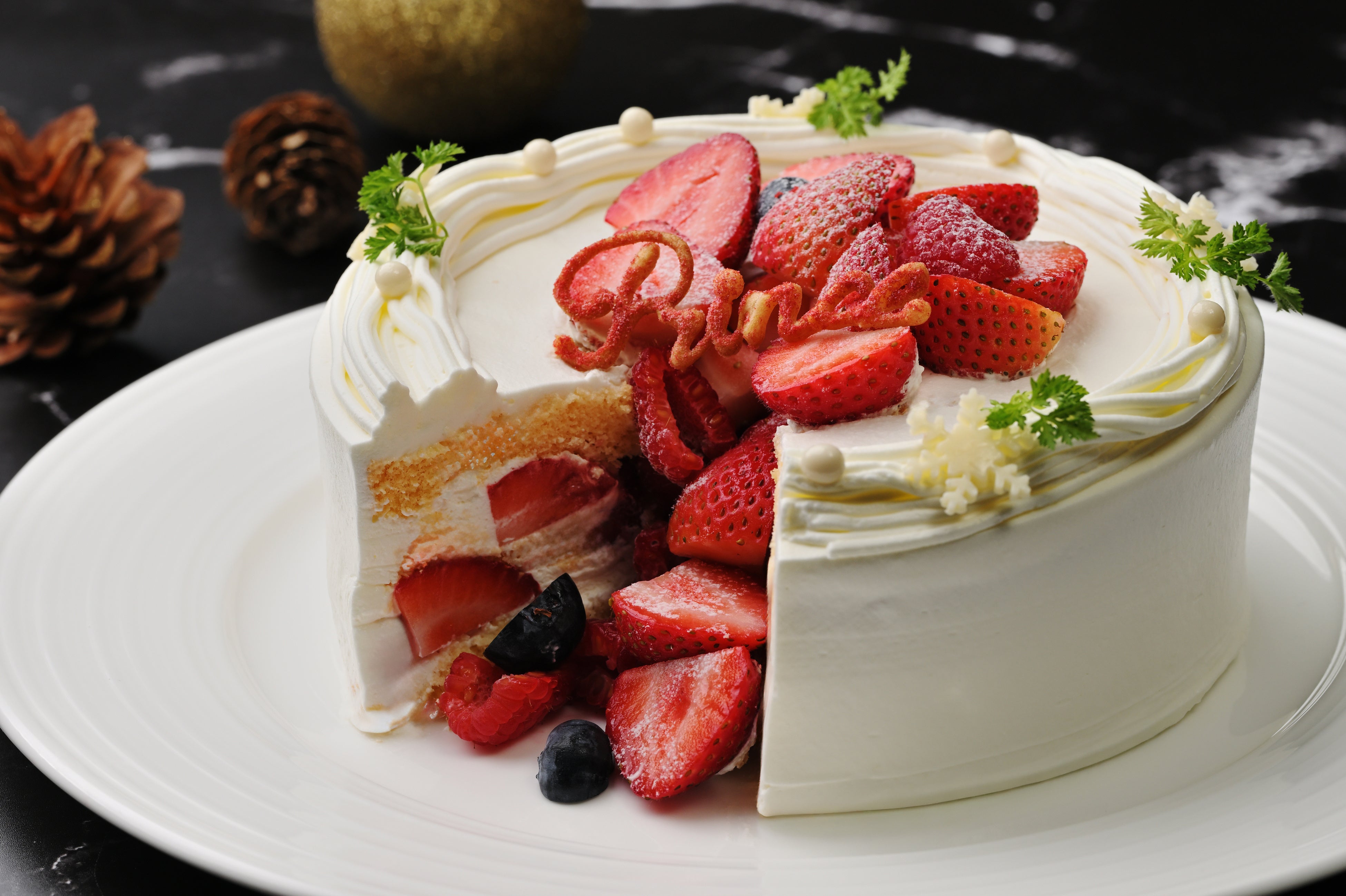 京都産のイチゴを使用した白いケーキの中にフレッシュなイチゴやラズベリー、ブルーベリーが隠れています。