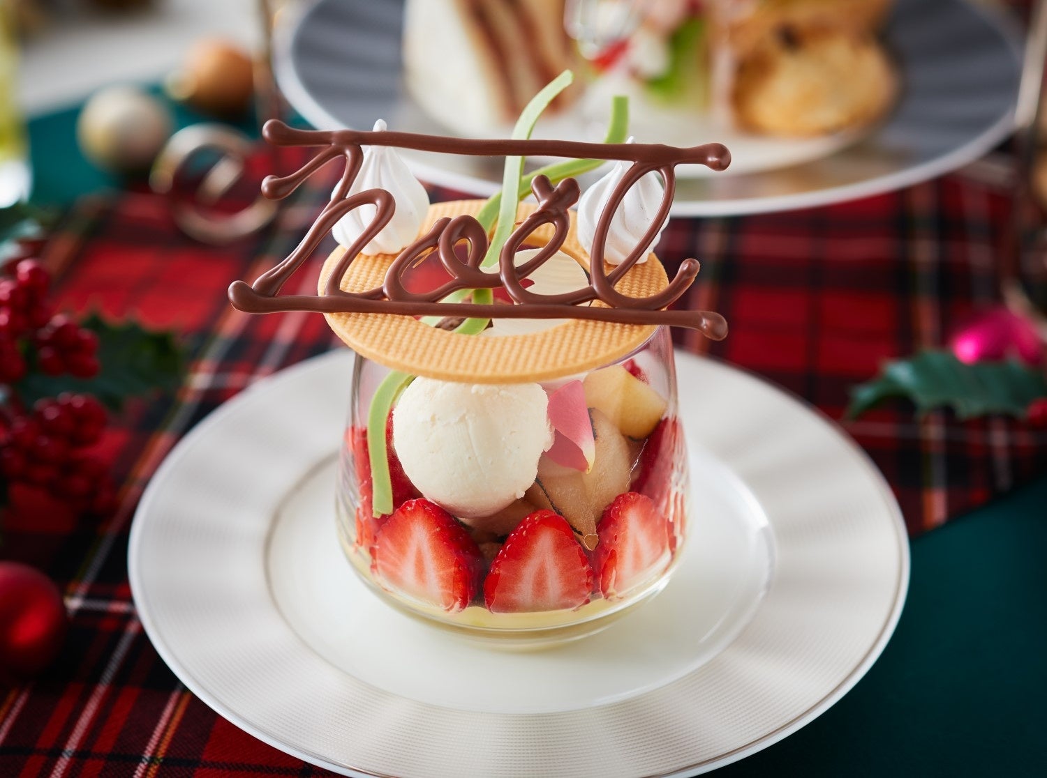 “Noel”のチョコレート文字を飾ったパフェは、コンポートした洋梨のキャラメリゼ、苺やアイスクリーム、ピスタチオパンナコッタなどが相性抜群の一品。中段にはサンタの帽子やクリスマスリース、ツリーをモチーフにした愛らしく華やかなスイーツ、下段にはクリスマスらしいキッシュやローストビーフサンド、シュリンプサラダなど食べ応えあるセイヴォリーを取り揃えます。詳細は下記をご高覧ください。