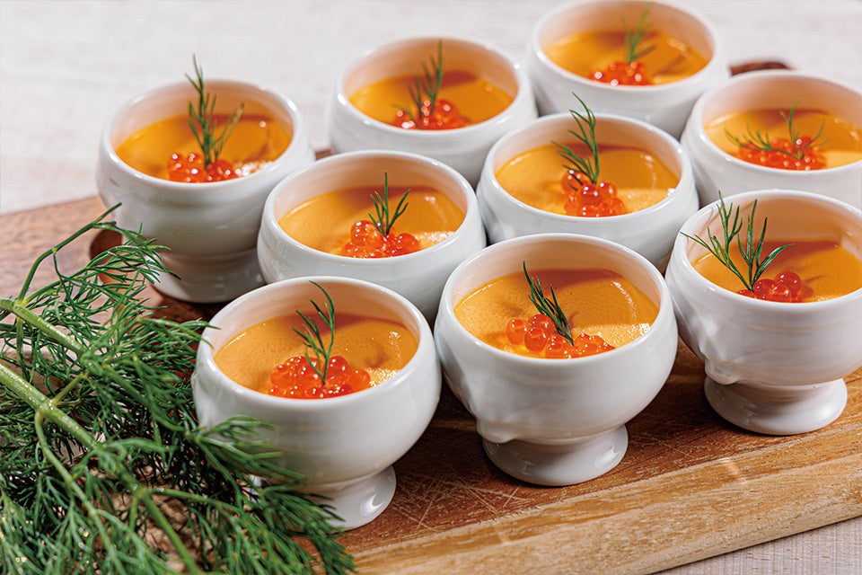 冷製料理のおすすめはプルンとした食感で、雲丹の風味やトッピングのイクラ、ディルのハーモニーが夏らしさを感じさせる「雲丹の冷製茶碗蒸し」。
