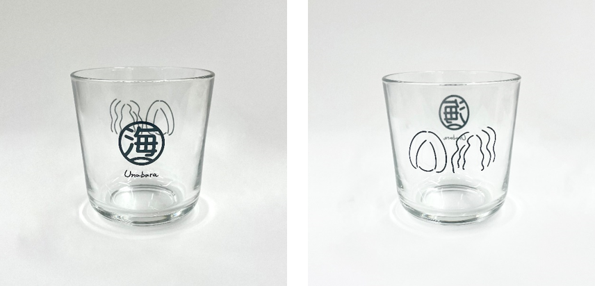 グラスタンブラーは、YASUTOMO COLLECTIONのロゴと「海」マークがプリントされたデザインです。