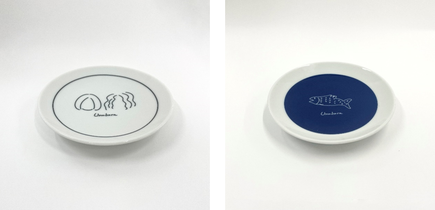 豆皿は、YASUTOMO COLLECTIONのロゴと海原ともこ描きおろしイラストの「魚」の2デザインが登場します。